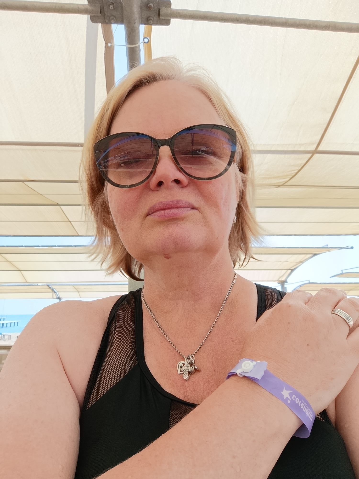 A middle-aged woman with blonde hair and dark sunglasses is posing for a selfie under a canopy. She is wearing a black top and a silver necklace with a heart-shaped pendant. A purple wristband is visi…read more
