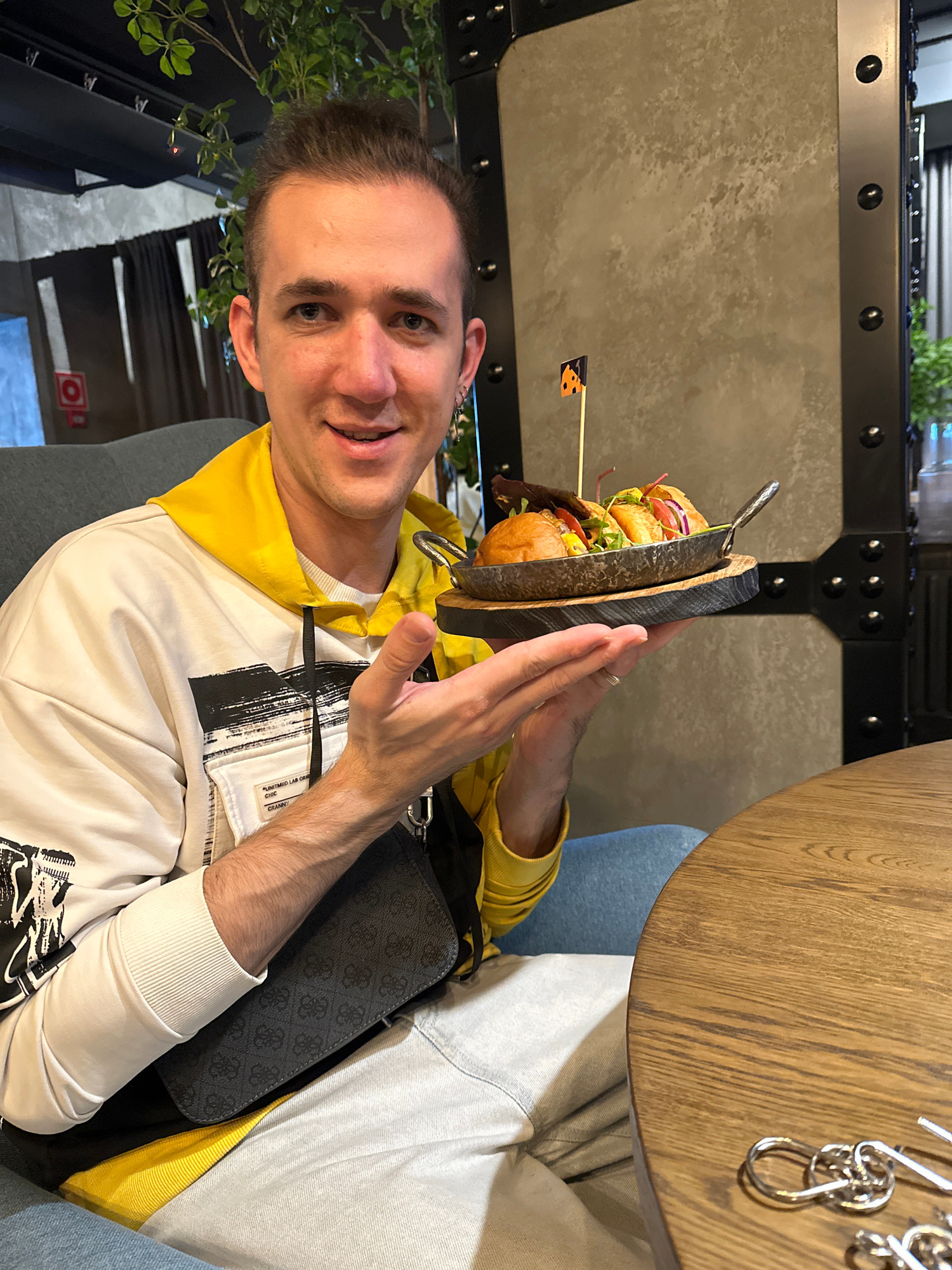 A person, identified as male, is seated at a table, holding a two-tier burger presentation in their hands. The burgers are stacked on a wooden board with a metal handle. The person is wearing a white…read more