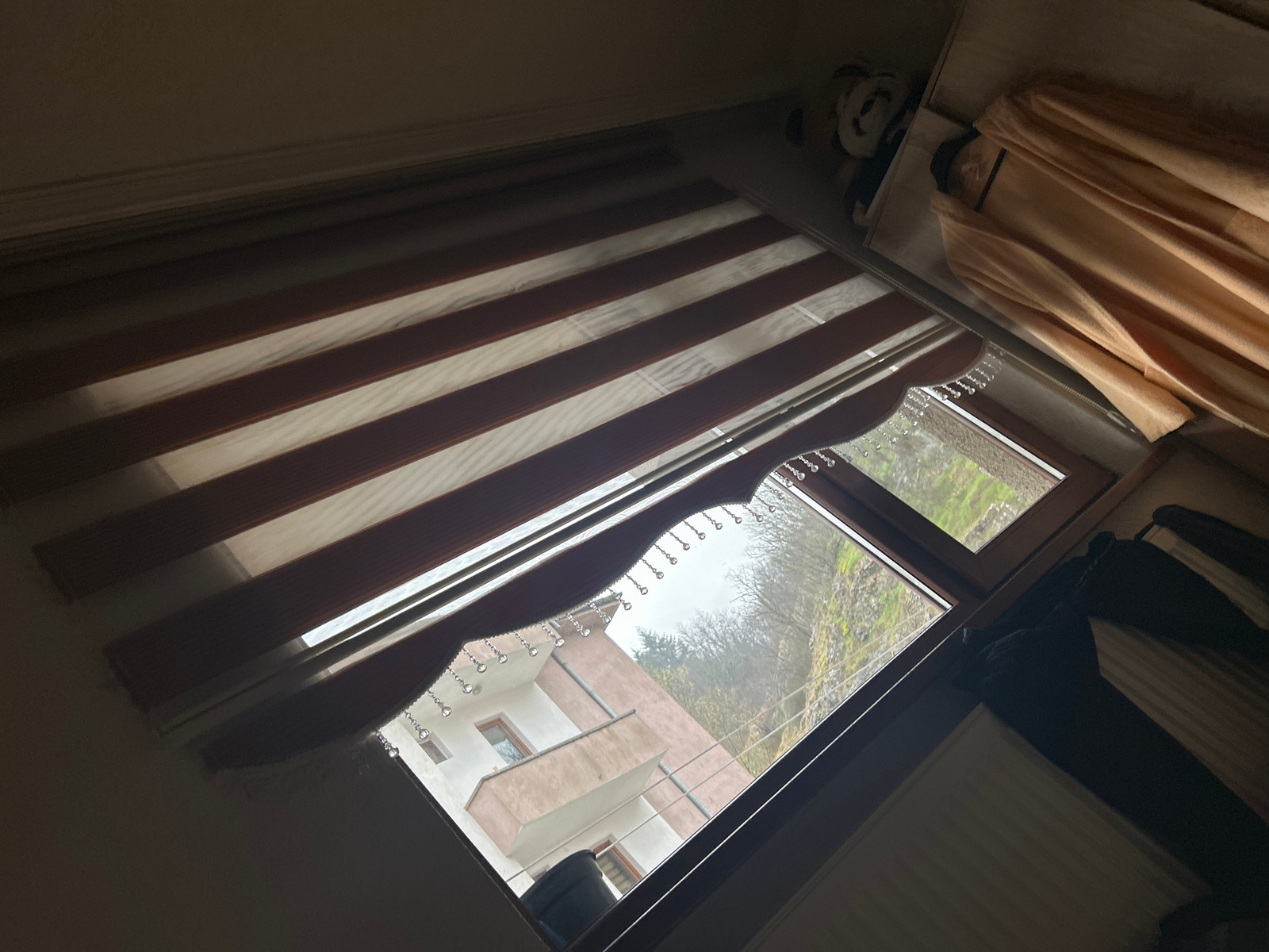 A tilted, close-up shot presents a window view in Zlatograd, Bulgaria. The window features horizontally striped blinds partially covering the scene outside, complemented by decorative, beaded trim alo…read more