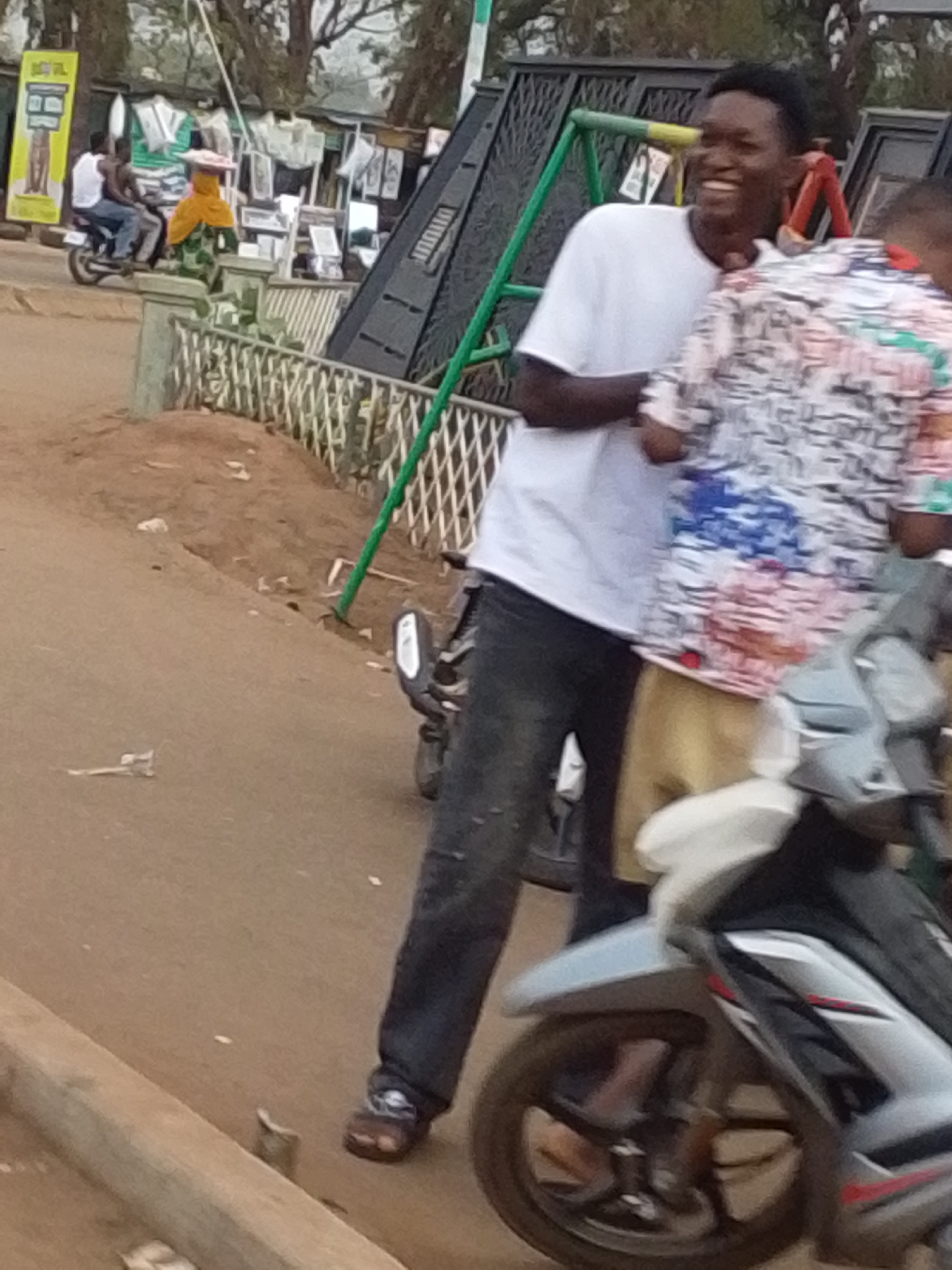In a daytime outdoor scene, a smiling, dark-skinned young man stands on a road in Tamale, Ghana. He wears a white short-sleeved t-shirt and dark jeans, with sandals on his feet. The man is positioned…read more