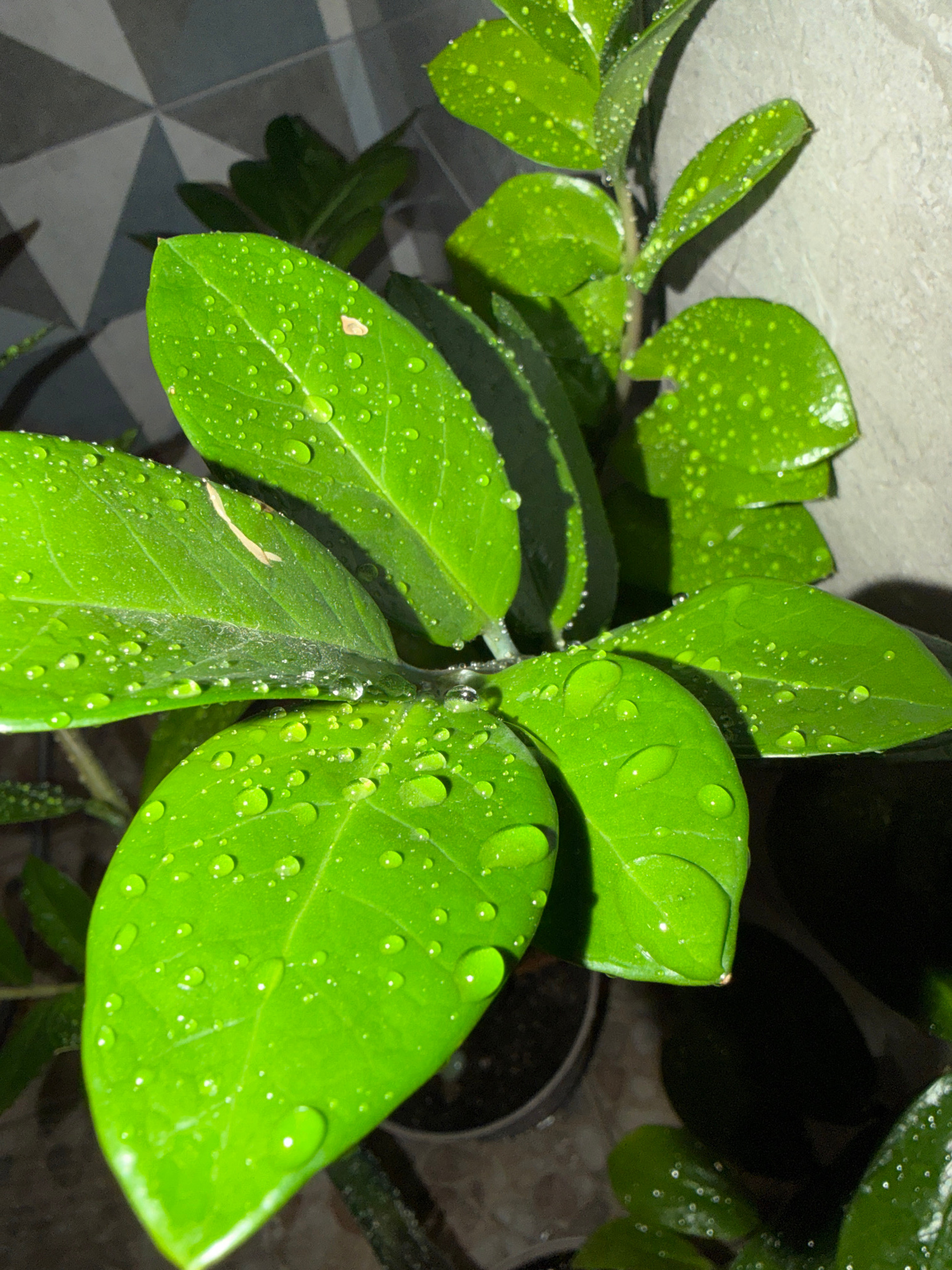 A close-up shot depicts a Zamioculcas zamiifolia plant, commonly known as a ZZ plant, with several glossy, bright green leaves covered in water droplets. The leaves are arranged in a cluster at the ce…read more