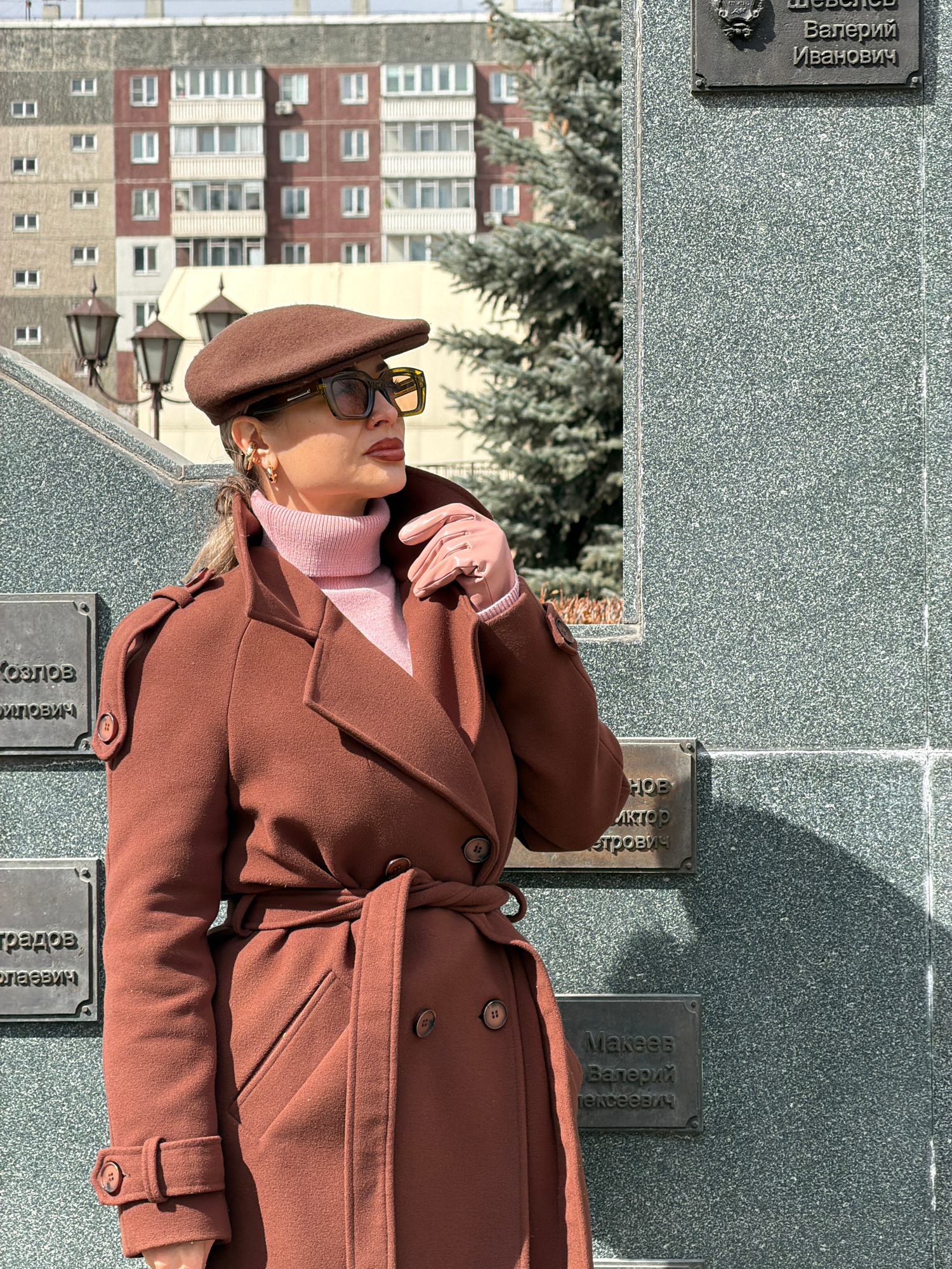 The image, originally oriented vertically, displays a woman posing outdoors on a sunny day in what appears to be a memorial area in Krasnoyarsk, Russia. The central figure is a woman, seen in profile from the chest up, looking upwards with a serene expression. She has light-colored hair and is fashionably dressed in dark-framed sunglasses, a brown beret-style hat, a pink turtleneck sweater, and a brown double-breasted coat. Her left hand, covered by a light pink glove, is gently raised towards her face. She is positioned alongside a substantial gray, speckled stone structure, which could be part of a monument or memorial wall. Several dark rectangular metal plaques are embedded into this stone, bearing Cyrillic text. Visible names on these plaques include "Шевелев Валерий Иванович" (Shevelev Valeriy Ivanovich) and "Макеев Валерий Алексеевич" (Makeev Valeriy Alekseevich). Partial names like "НОВ Виктор етрович" (Nov Viktor etrovich), "КОЗЛОВ ОЛАЕВИЧ" (Kozlov Olaevich), and "традов" (tradov) are also discernible, indicating that these are likely names of individuals being commemorated. In the background, evergreen trees with dark green foliage are visible, partially obscuring multi-story residential buildings with numerous windows and balconies. The architectural style of the buildings suggests an urban setting typical of post-Soviet era structures. The bright sunlight casts distinct shadows, indicating a clear, sunny day. The scene evokes a contemplative atmosphere at a commemorative site within an urban landscape. | Open Wire