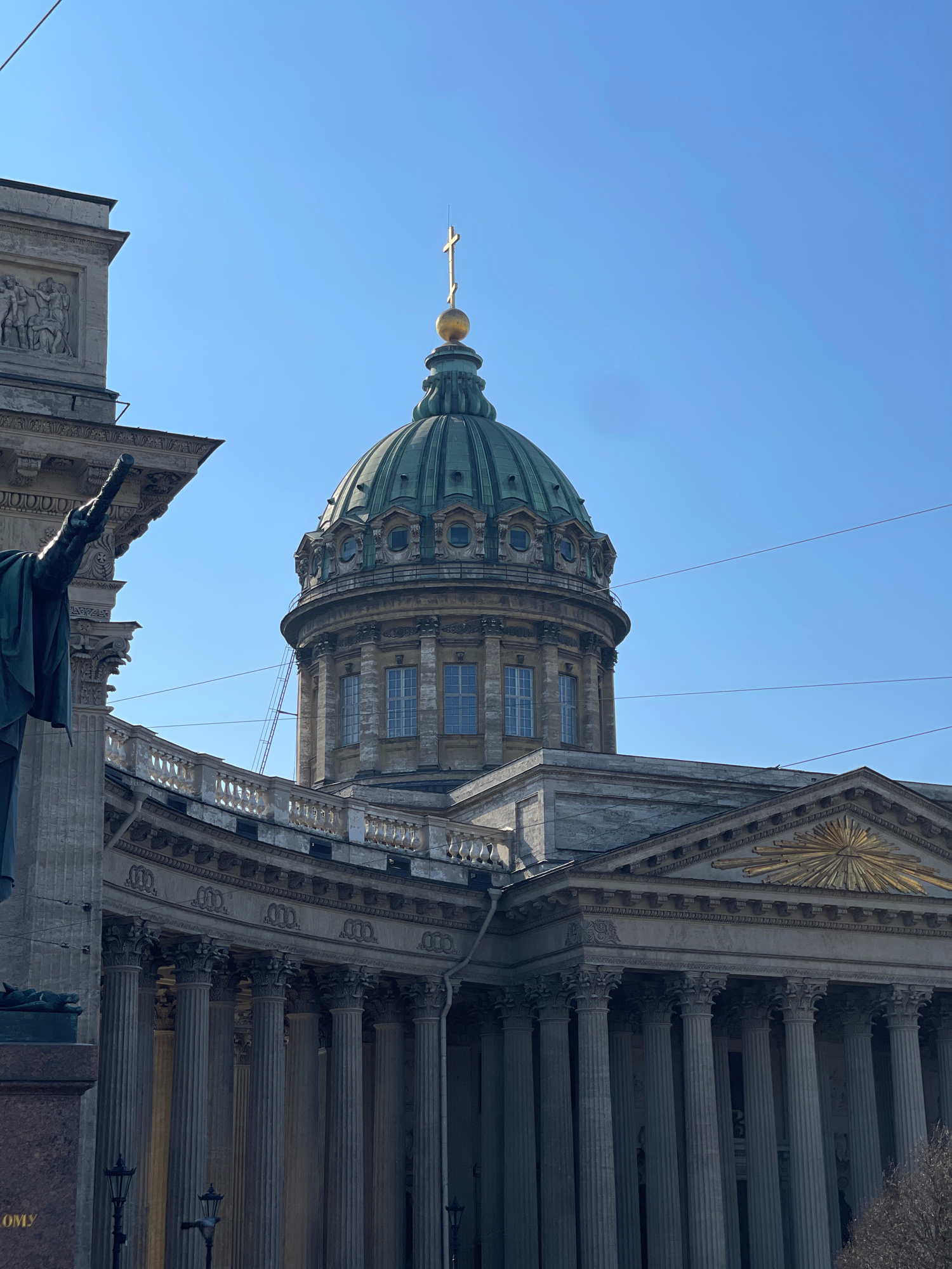 The image shows the Kazan Cathedral in Saint Petersburg, Russia, viewed from below. The focus is on the cathedral's dome, topped with a golden cross, and the adjacent architectural details, including…read more