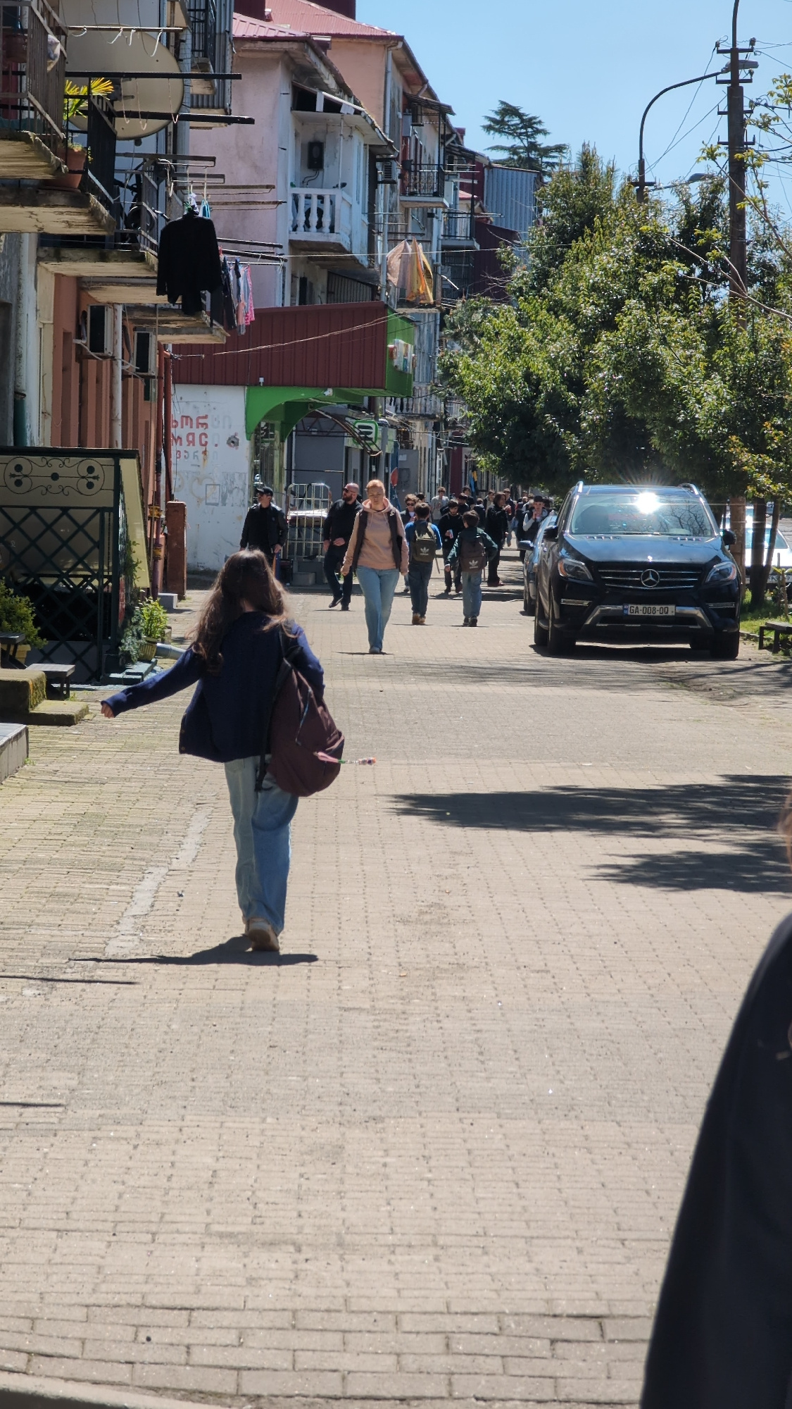 The image depicts a paved street in Kobuleti, Georgia, with a group of people walking down the street. A dark-colored SUV is parked at the far end of the street. On the left side, there are buildings…read more