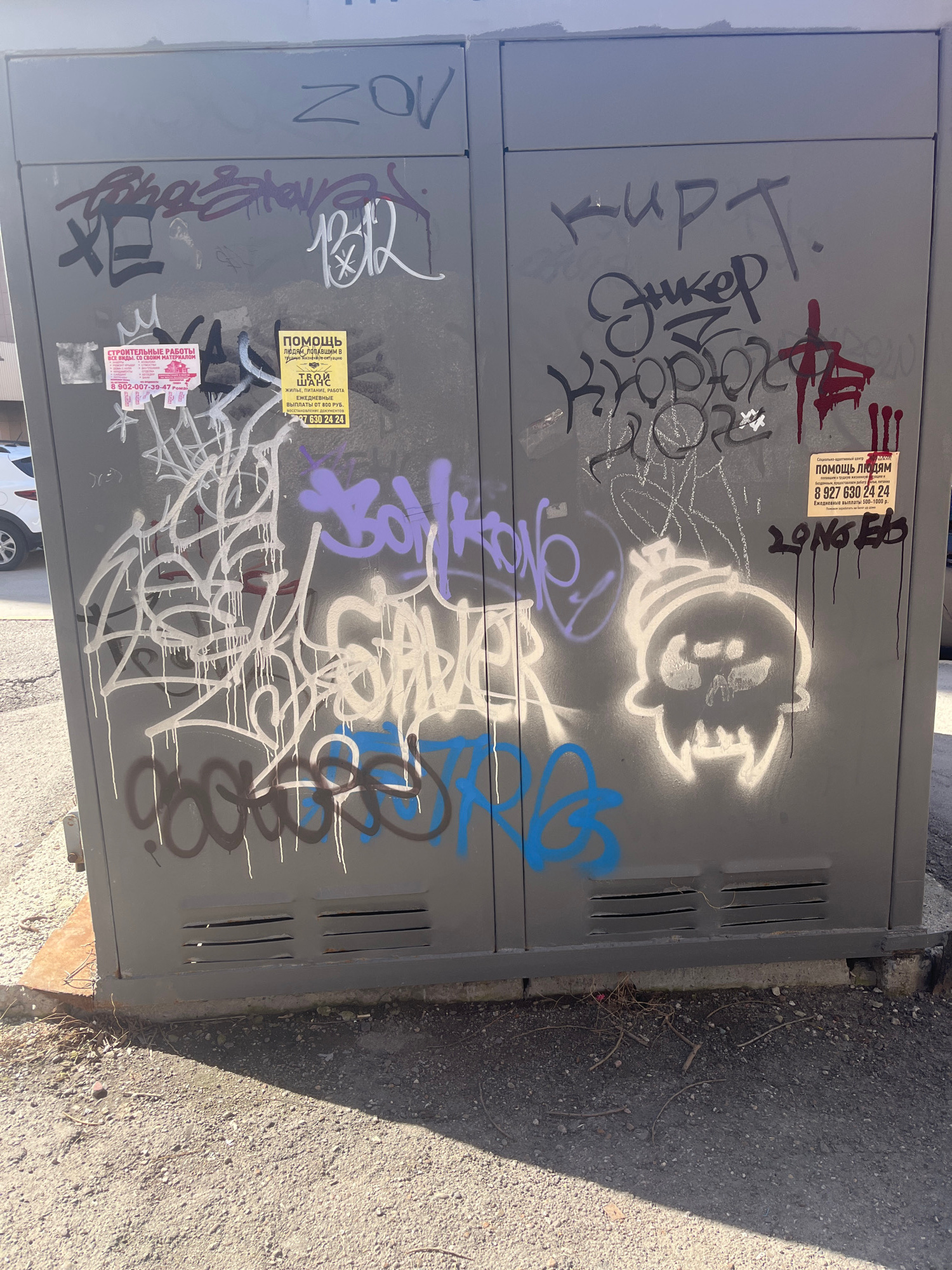 The image captures a gray metal utility box, likely an electrical or telecommunications cabinet, situated outdoors on an asphalt surface, possibly a sidewalk or roadside in Ulyanovsk, Russia. The scen…read more
