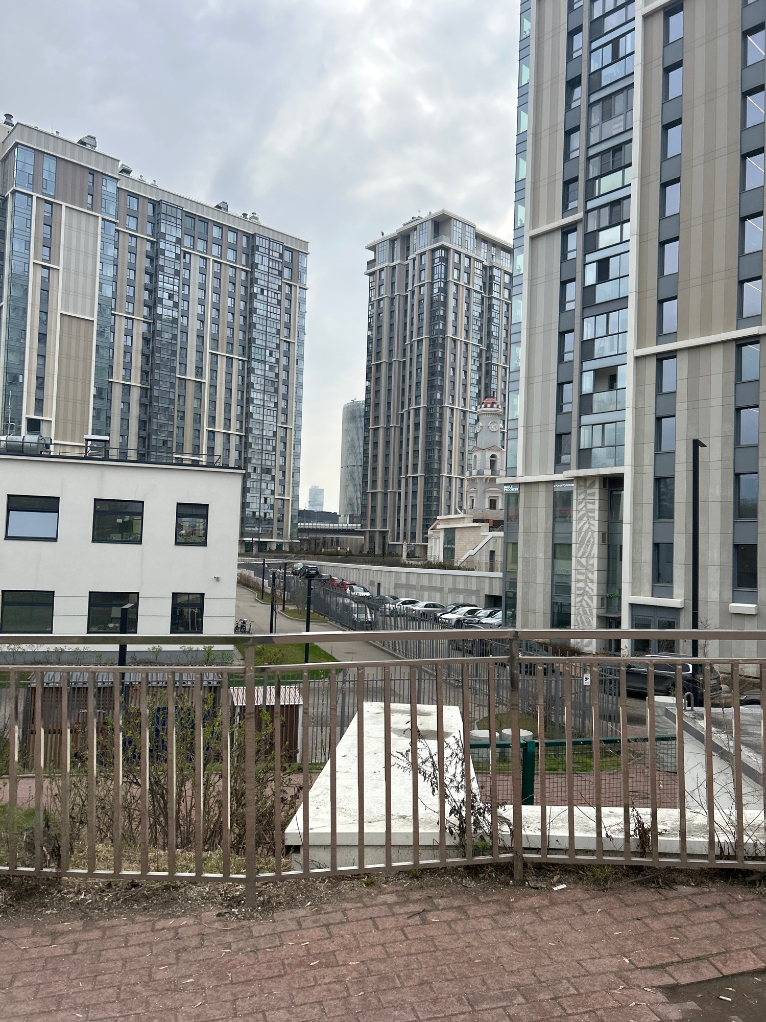 The image depicts a modern urban landscape in Moscow, Russia, under an overcast sky. Several tall, contemporary buildings with multi-story glass windows and facades of varying shades of grey and white…read more