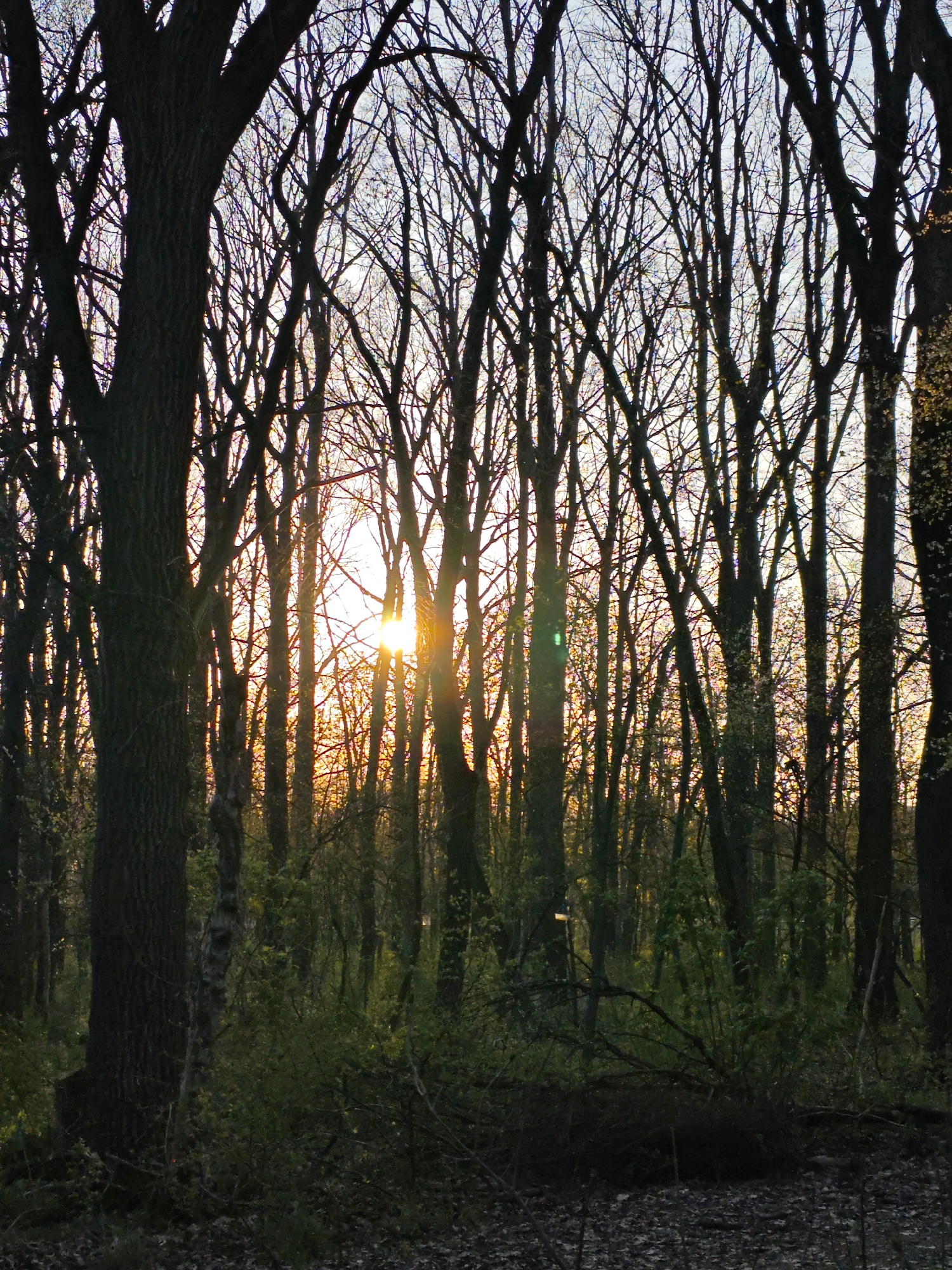 The image depicts a dense forest at sunset. The location is not specified, and the prompt to include Pyatigorsk, Russia, is irrelevant based on the visual information. Tall trees with bare branches do…read more