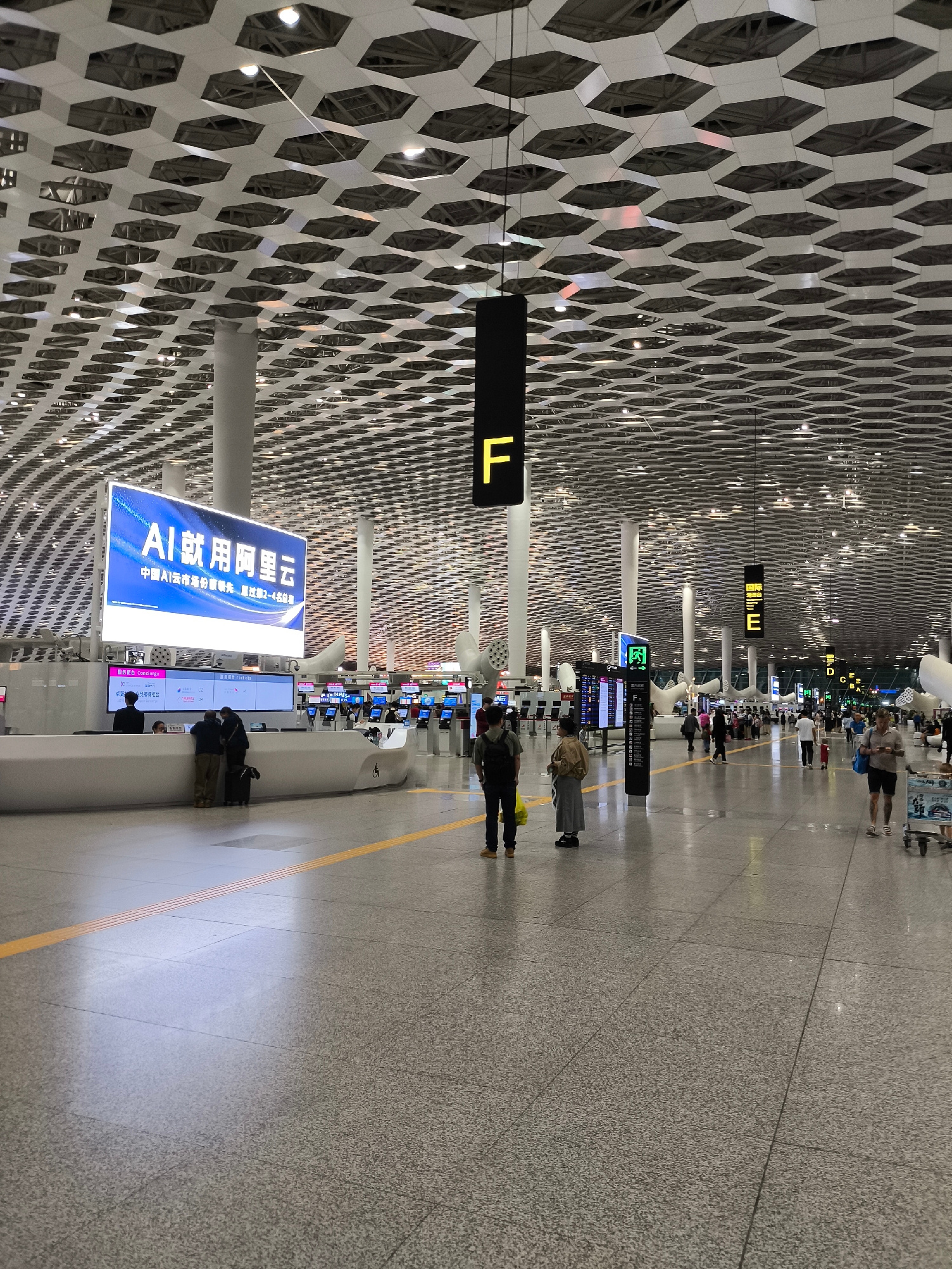 The image captures an indoor scene at what appears to be an airport terminal in Bao'an District, China, based on the signs written in Chinese. The architecture features a high ceiling with a white, he…read more