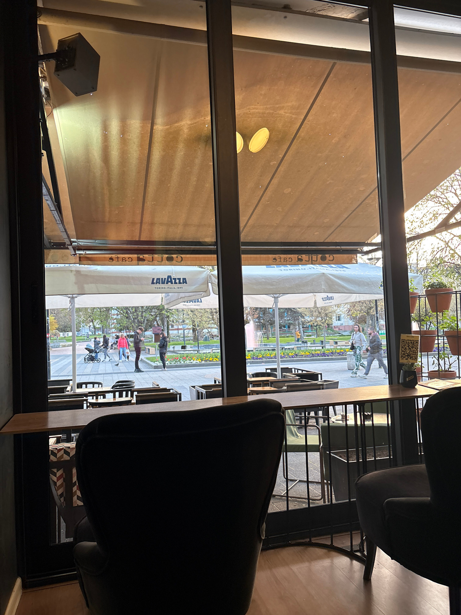 The image shows an interior view looking out through a window of a cafe, likely in Pleven, Bulgaria, based on the signage. The cafe exterior features awnings bearing the "LAVAZZA TORINO CAFE" logo. Pe…read more