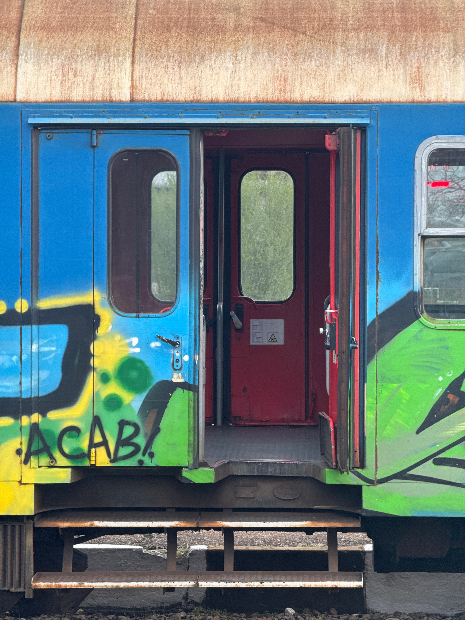 The image shows an open door on a train car, covered in graffiti, in what appears to be the city of Karlovo, Bulgaria. The door is blue with yellow and green graffiti; “ACAB!” is visible. The doorfram…read more