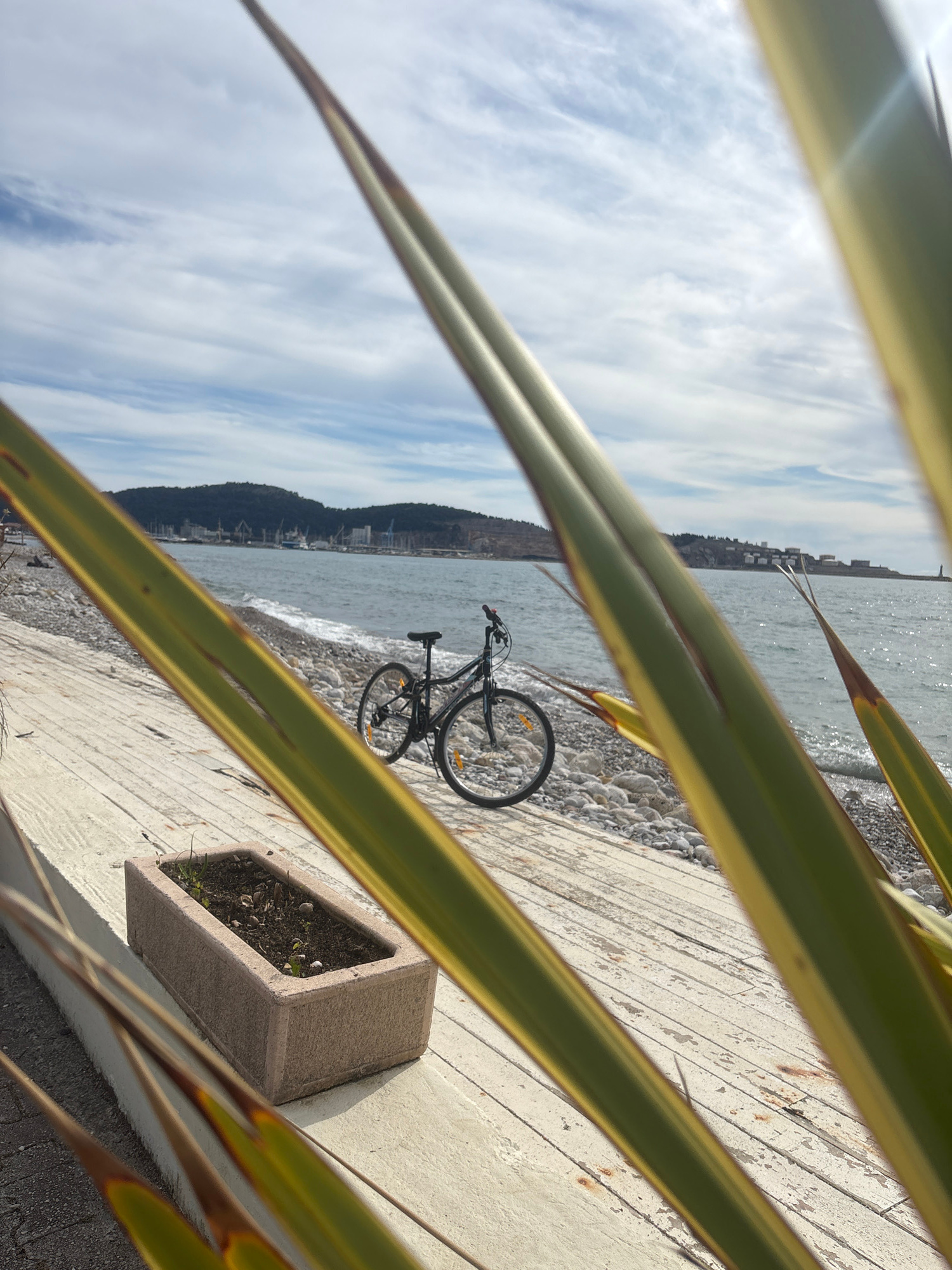 A bicycle is leaning against a wall separating a seaside promenade from a rocky beach in Bar, Montenegro. The bicycle is black and appears to be a hybrid or road bike. Behind the bicycle is the Adriat…read more