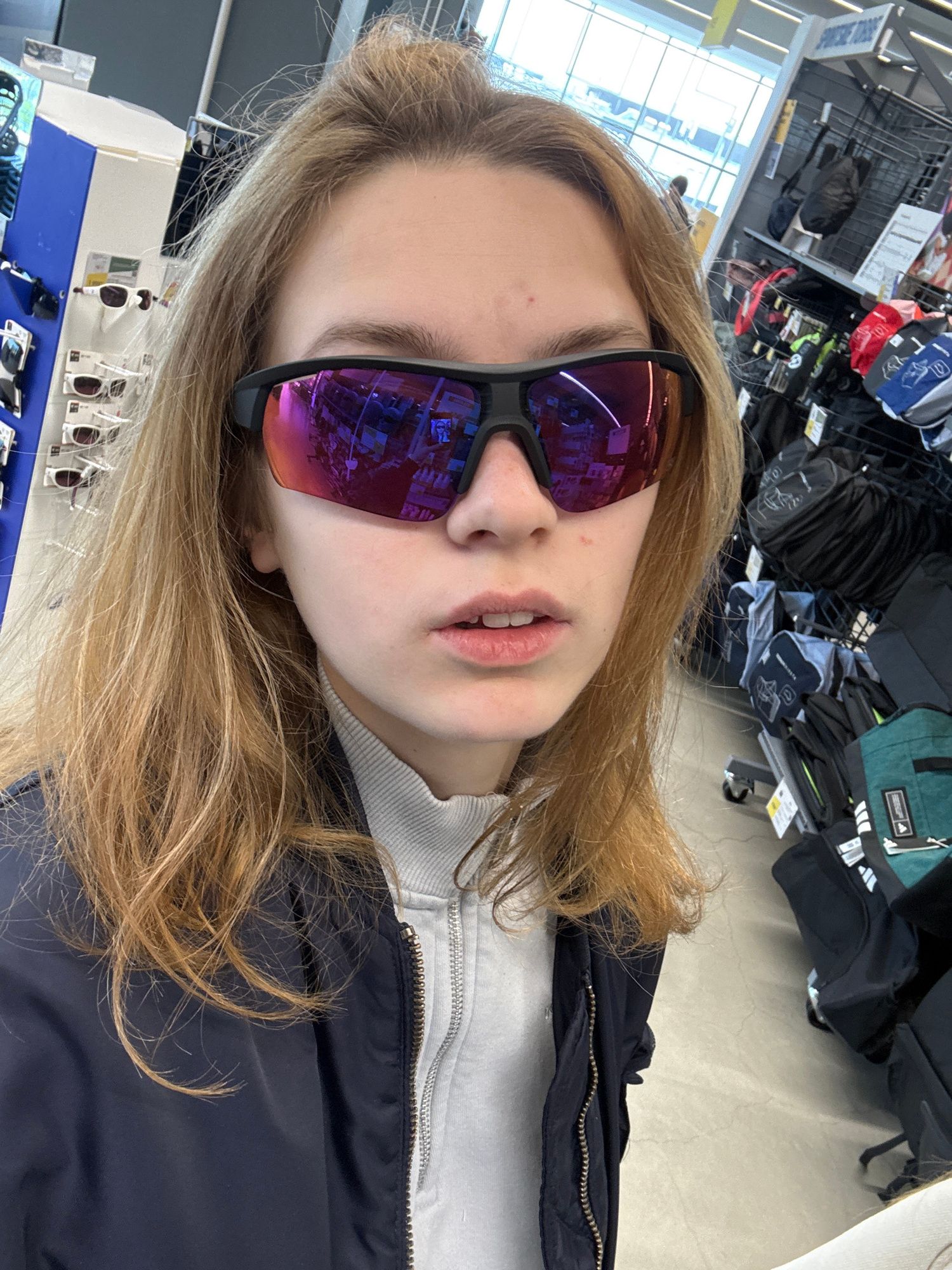 A close-up, angled selfie captures a young person inside what appears to be a sporting goods retail store. The subject, who has long, wavy blonde or light brown hair, is wearing prominent, black-frame…read more