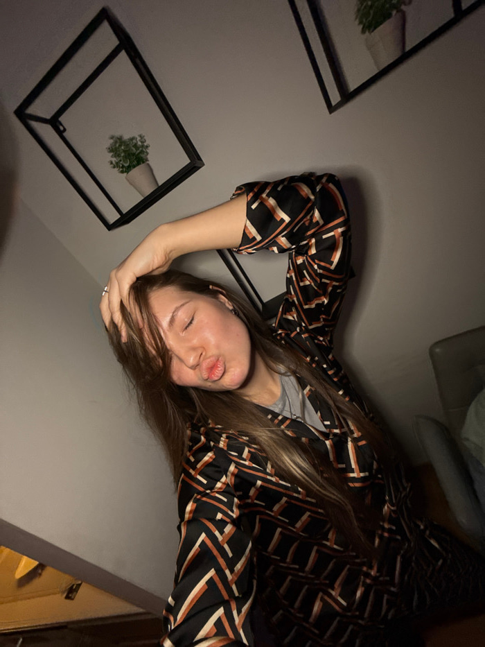 A woman reclines, her head resting on her hand, with her eyes closed and lips puckered. She wears a patterned black and brown blouse over a grey shirt. Her long brown hair cascades around her face and…read more