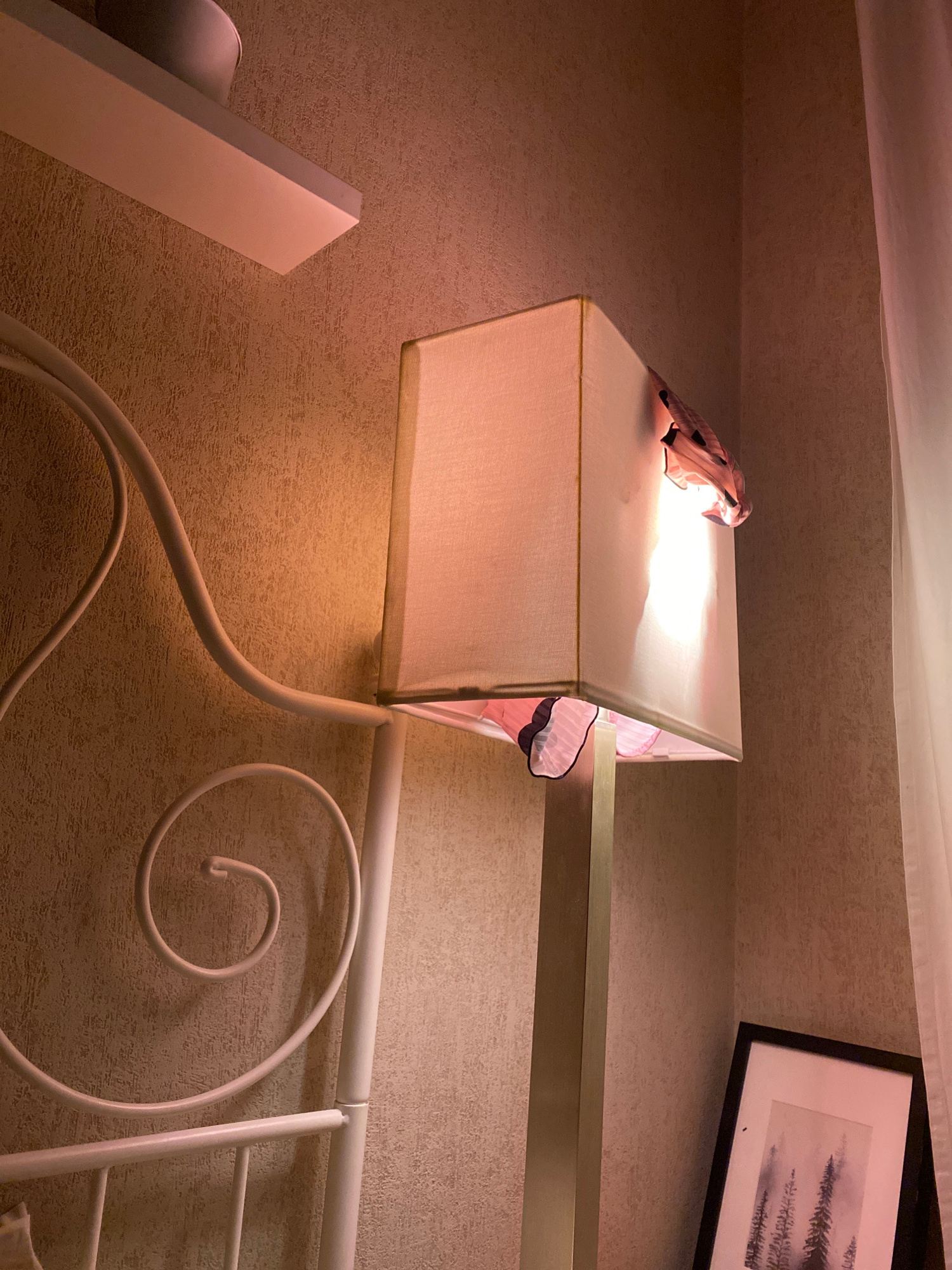 The image depicts a bedroom interior, possibly in a residential building. The main subject is a bedside lamp with a rectangular shade, emitting a warm glow. The lamp is attached to a metal arm extendi…read more