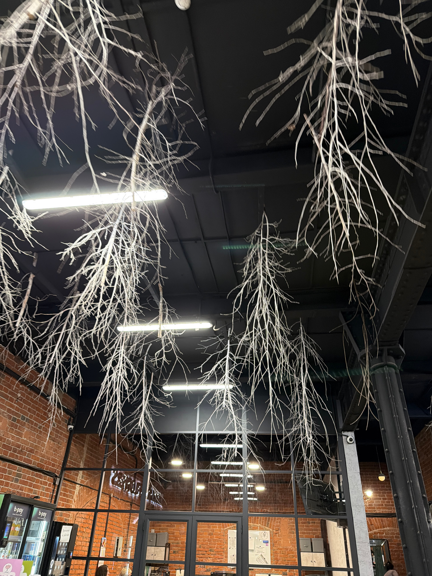 The image depicts an interior space in Moscow, Russia. The scene is viewed looking up at a ceiling with exposed industrial elements such as pipes and beams. Decorative white branches extend across the…read more