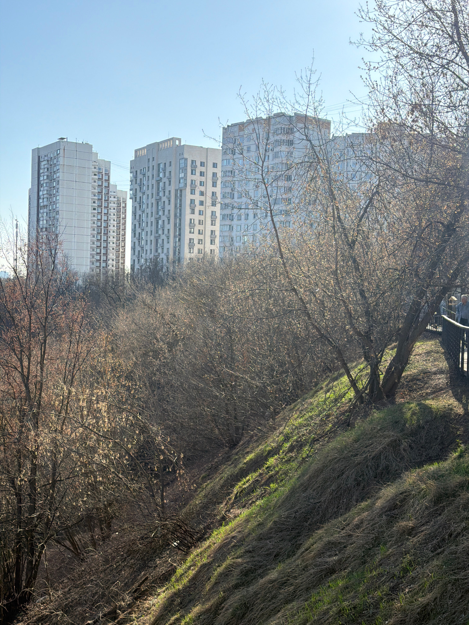The image shows a view in Khimki, Russia, featuring several tall apartment buildings on the left side of the frame. These buildings are predominantly light-colored and exhibit a repetitive pattern of…read more