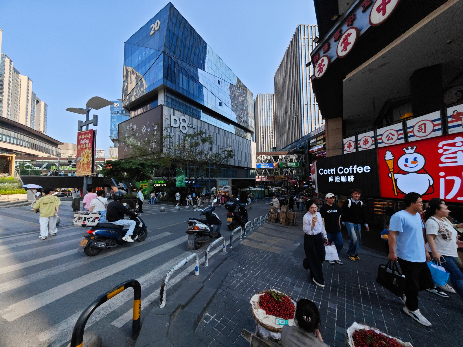 The image presents a bustling street scene in a commercial district within Yuzhong District, China, during a clear and sunny day. The setting is dominated by modern, glass-clad skyscrapers, with one l…read more