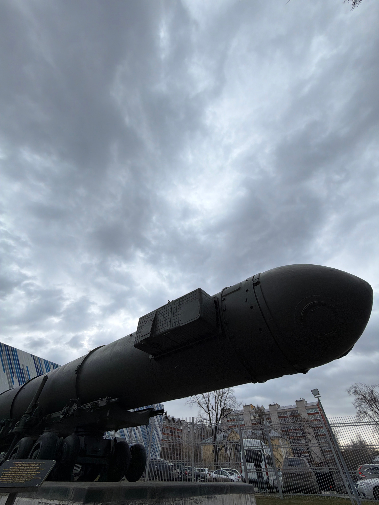 The image presents a dramatic low-angle view of a large, dark-colored missile or rocket, silhouetted against a predominantly cloudy, overcast sky. The missile, likely a strategic ballistic missile, oc…read more