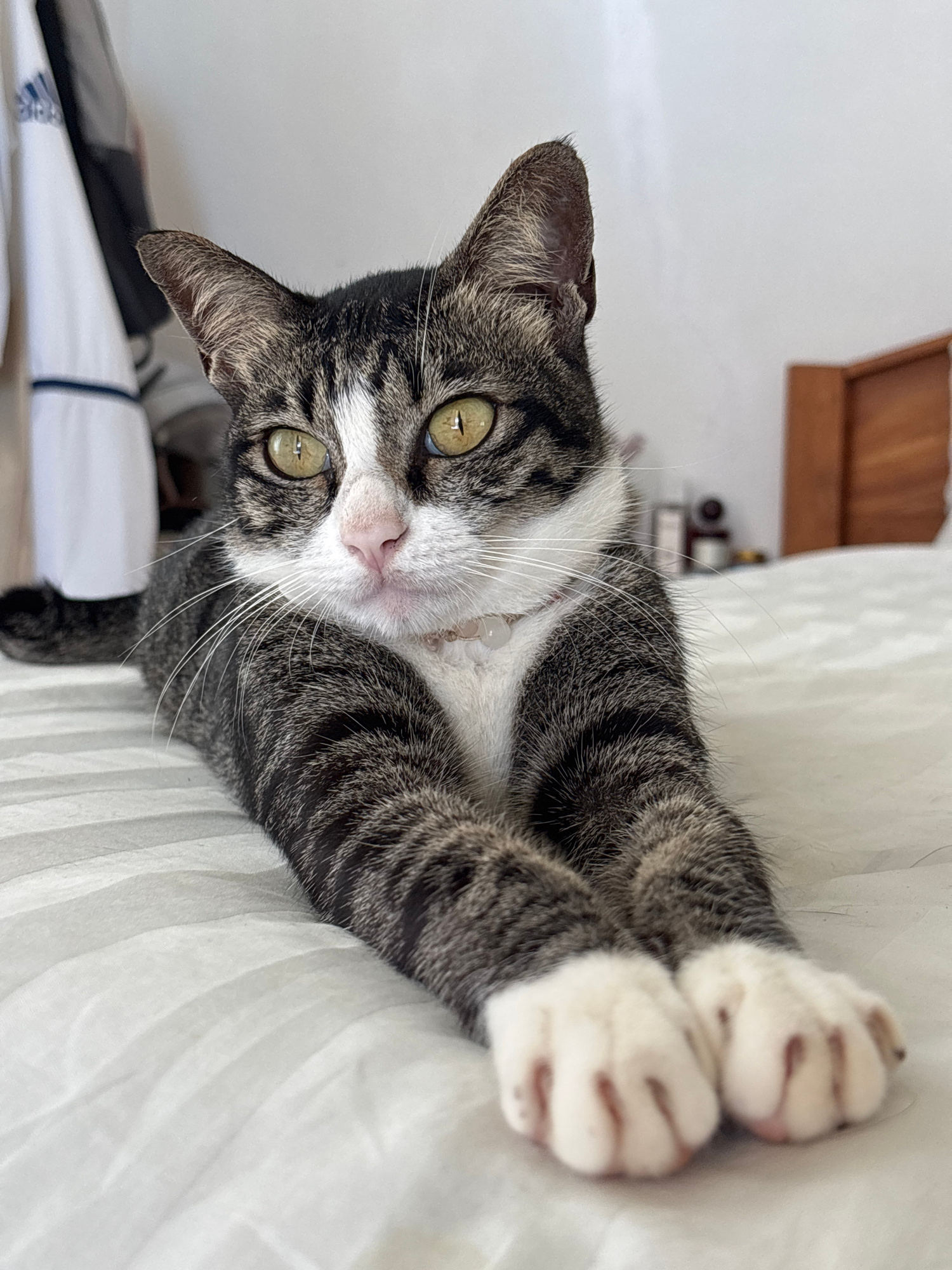 The image features a domestic short-haired cat with a striking tabby and white coat. The cat exhibits a pattern of grey and black stripes across its body, complemented by a white chest, muzzle, and pa…read more