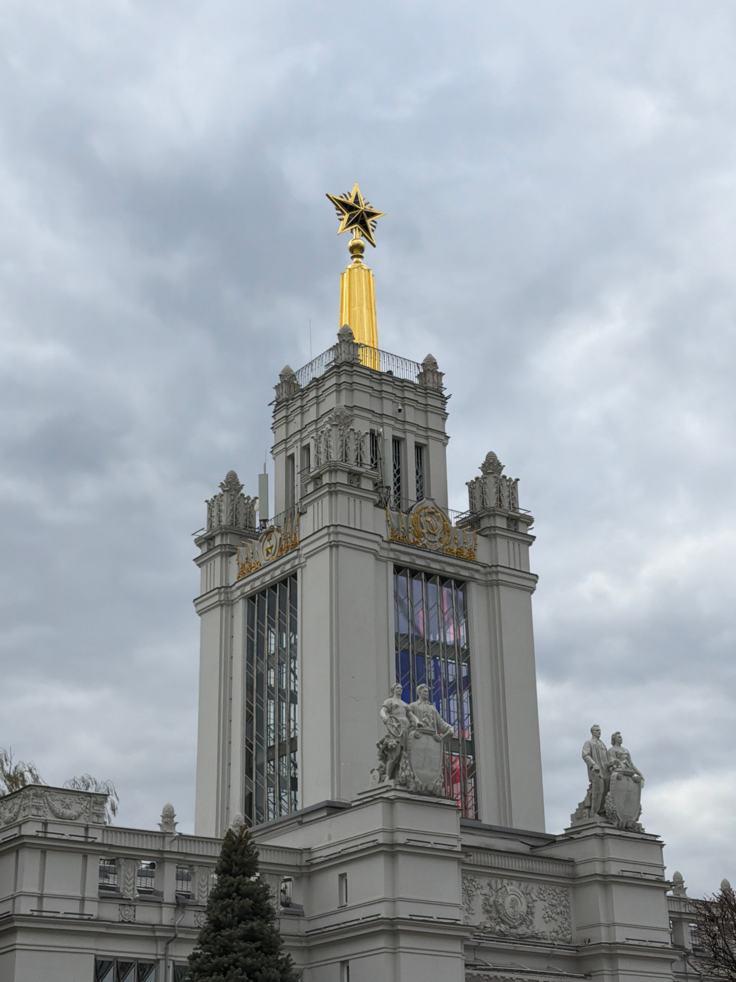 A majestic, ornate building is captured under an overcast, cloudy sky. The image primarily features the upper section of a grand architectural structure, characterized by its light-colored facade (lik…read more