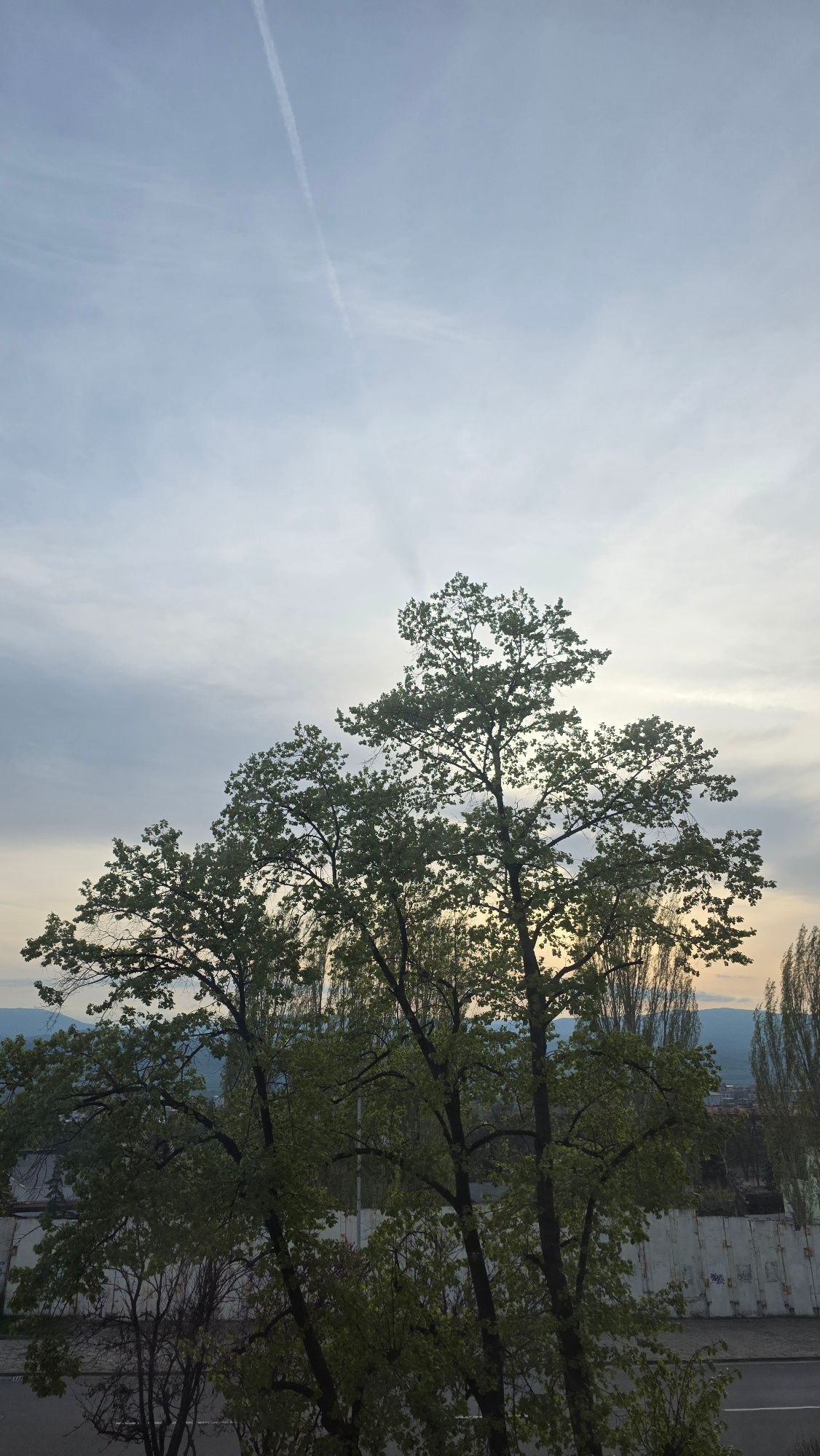 The image presents a tree with sparse green leaves against a backdrop of a pale blue sky streaked with clouds and a contrail. The foreground shows tree branches extending towards the upper portion of…read more