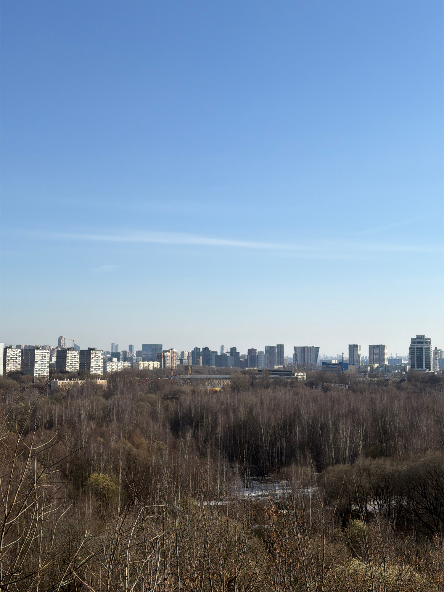 The image depicts a view of the city of Khimki, Russia, bisected vertically. The left side shows a clear blue sky. The right side features a row of buildings fading into a forest. A body of water cuts…read more