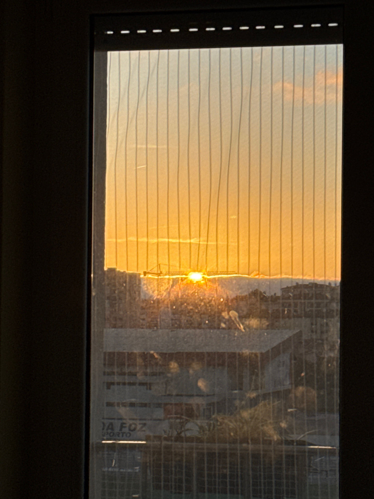 The image depicts a sunset viewed through a window with horizontal blinds. Part of the blinds are pulled shut, and the sunset casts a warm, golden light on them. The rest of the view is a transparent…read more