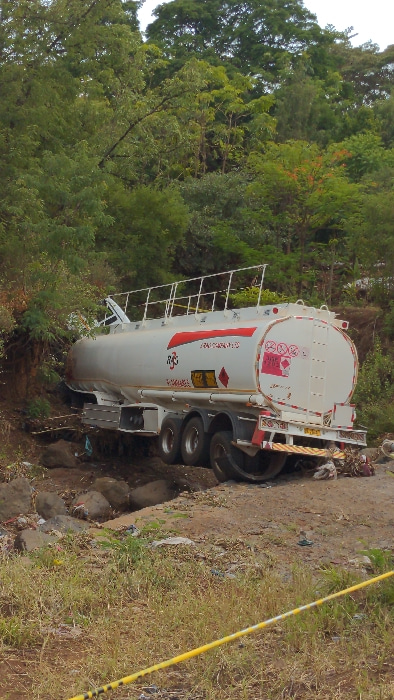 A white tanker truck is observed lodged into a dirt embankment within the city of Moshi, Tanzania. The cylindrical tank features red stripes, "RGC" lettering, and partially visible text indicating "FA…read more