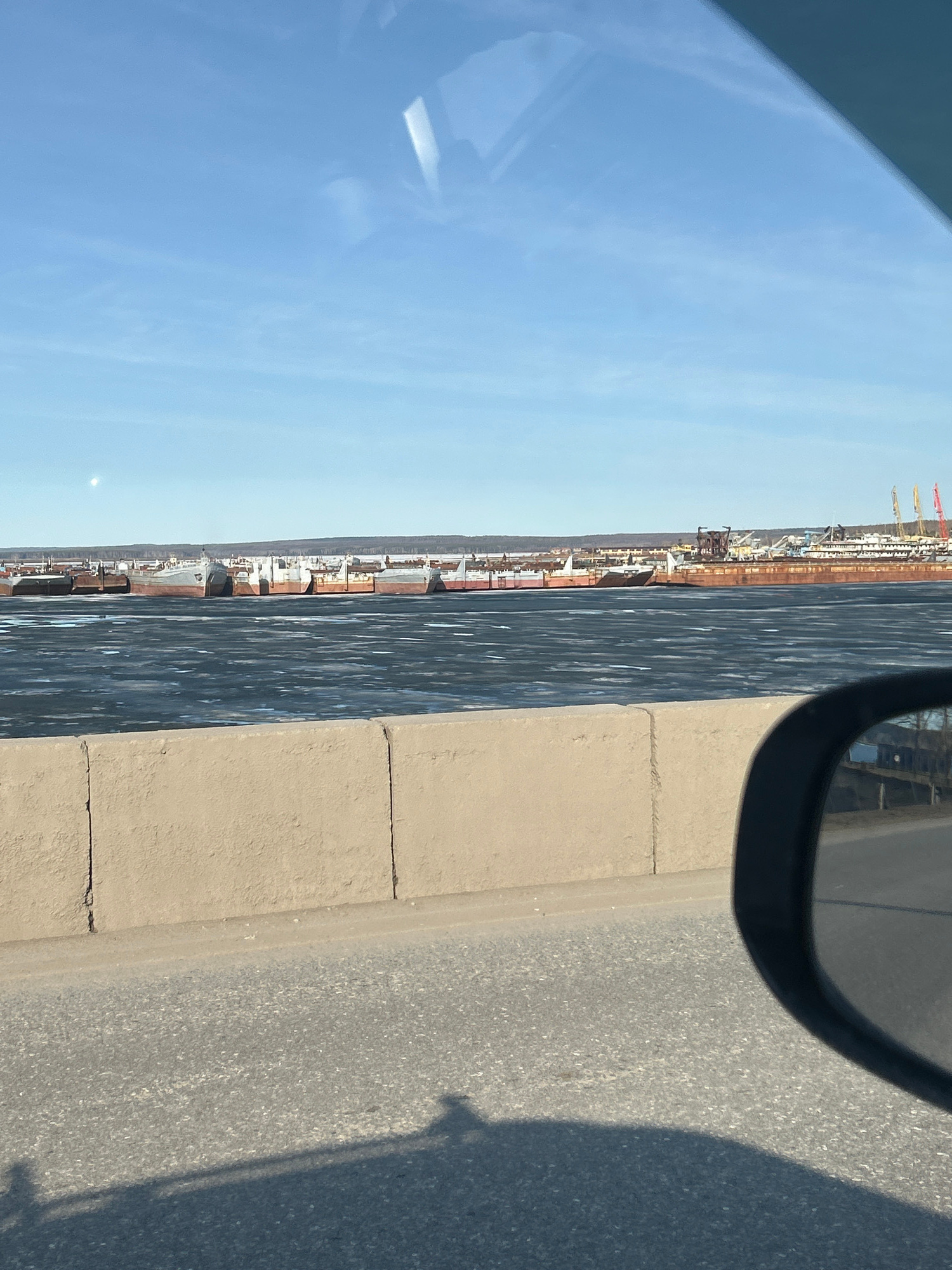 A sideways, eye-level shot taken from inside a moving vehicle, likely a car, shows a view of a canal or wide river with docks and what appears to be a large industrial area stretching along the opposite bank. The sky is clear and blue. A portion of the car's side view mirror and a section of the car's window frame are visible. The canal appears to have some ice or slush on the surface. Along the near side of the road, a concrete barrier separates the road from the canal. The photo was most likely taken in the city of Chaikovsky, Russia. | Open Wire