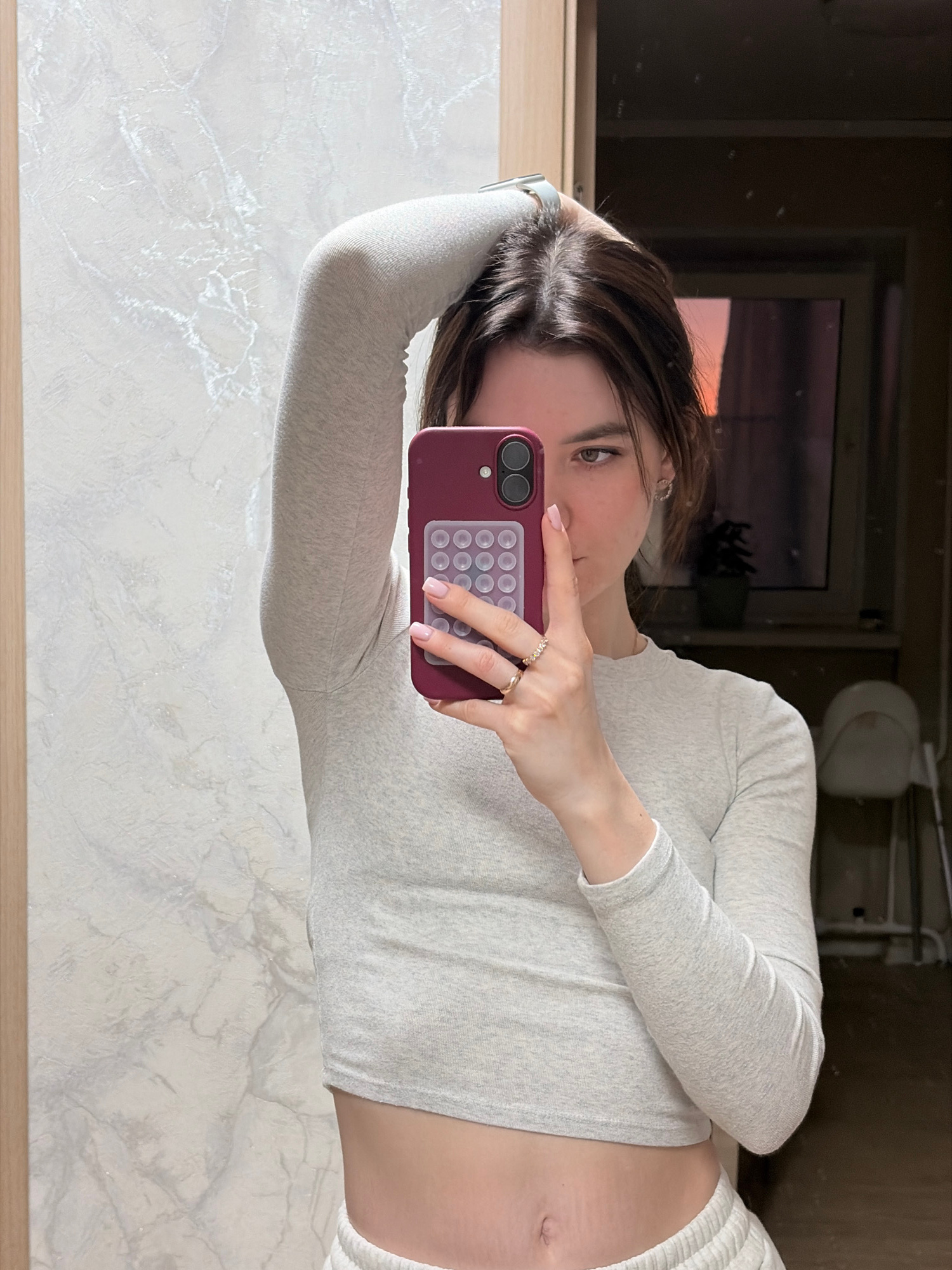 An indoor mirror selfie captures a young woman, partially visible, looking directly into the camera with a neutral expression. She has medium-dark brown hair and fair skin. She wears a light grey, lon…read more