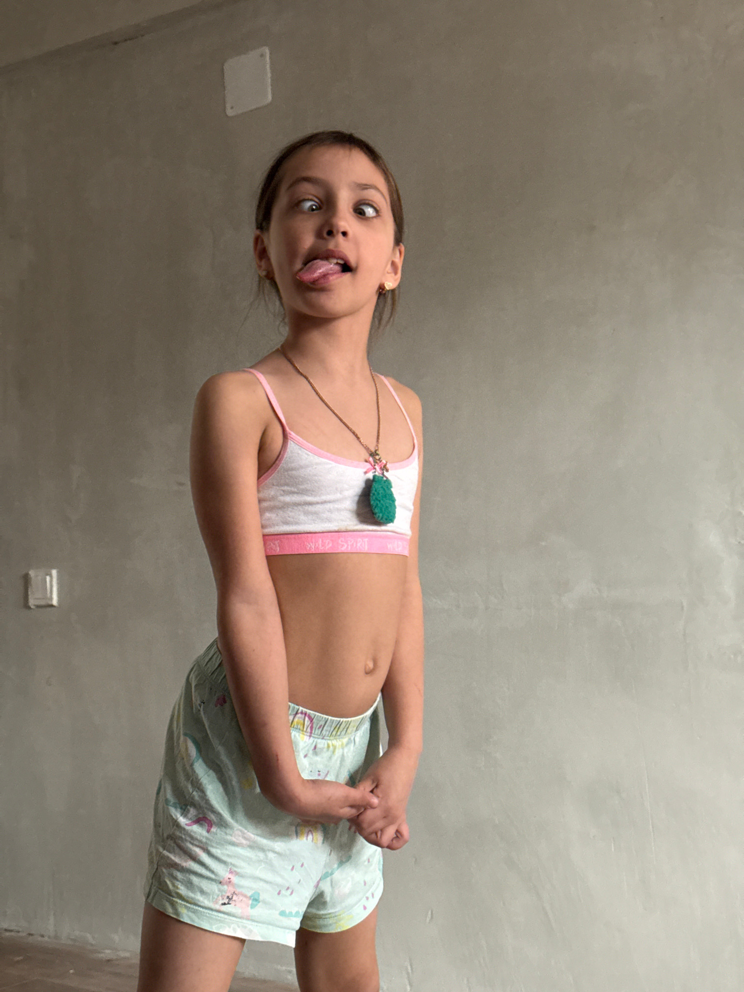 A young girl, approximately 7-10 years old, is the central subject of an indoor photograph, likely taken in Votkinsk, Russia. The image is oriented ninety degrees clockwise, depicting the girl strikin…read more
