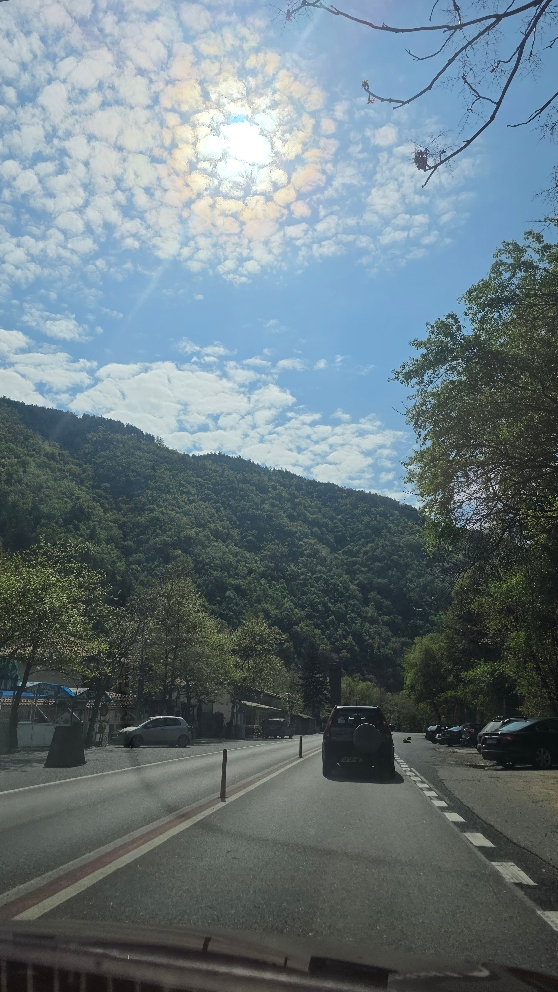 The photograph is taken at street level and is a vertical perspective with landscape features. The sky takes up about half of the frame on the left and is filled with patchy clouds illuminated by the…read more