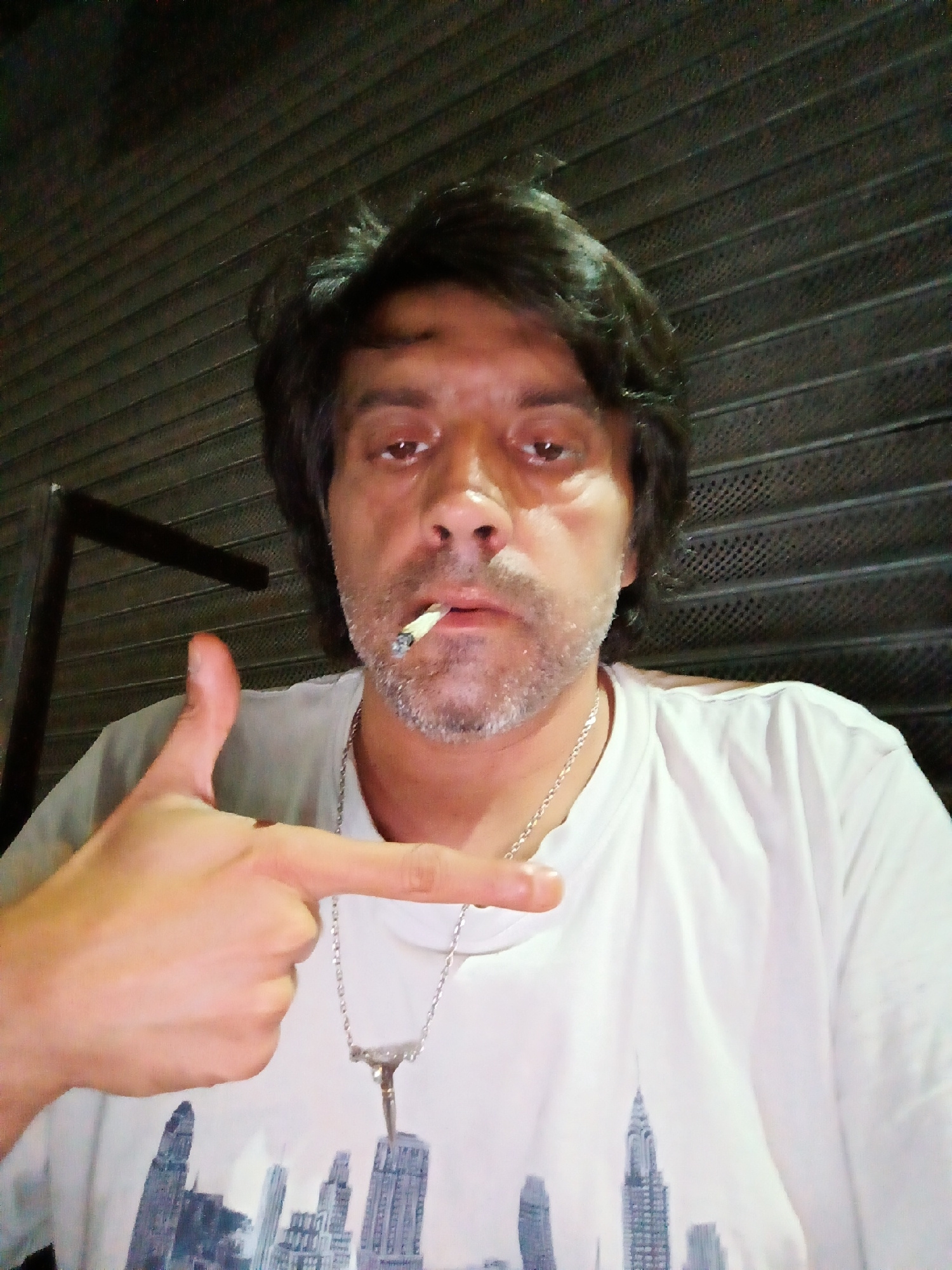 A man with dark hair and a salt-and-pepper beard holds a cigarette in his mouth and points with his left hand. He is wearing a white t-shirt with an image of a cityscape and a silver chain with a pend…read more