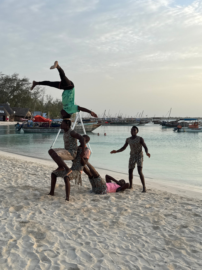 Five dark-skinned males are positioned in an acrobatic pyramid on a light-colored sandy beach in Kendwa, Tanzania. The base consists of one male lying supine on the sand, wearing a pink t-shirt and pa…read more
