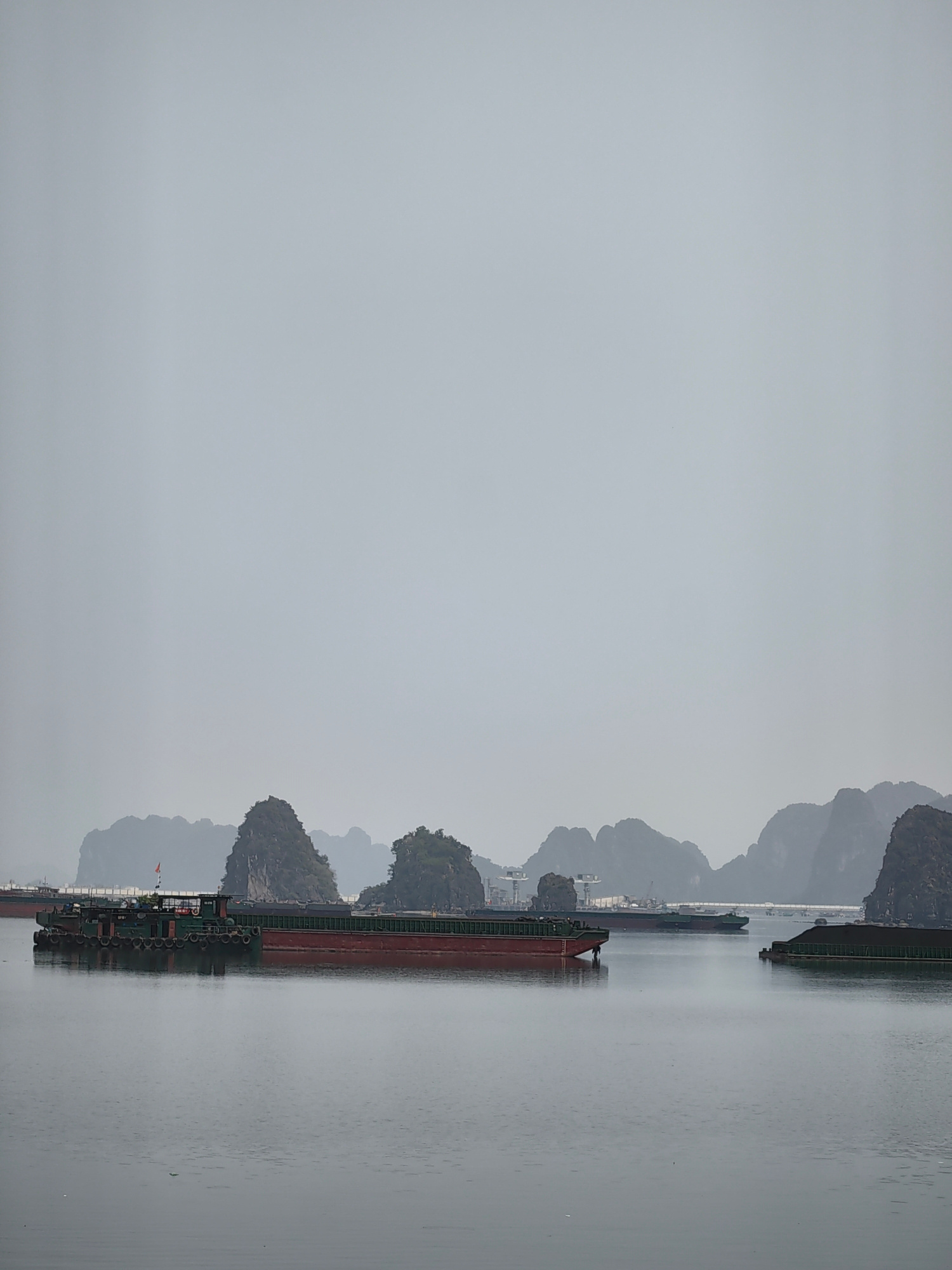 This is an outdoor scene, featuring a body of water (likely a bay or harbor) with several flat-topped islands or karsts in the background, typical of Ha Long Bay. The location is Quang Hanh Ward, Viet…read more