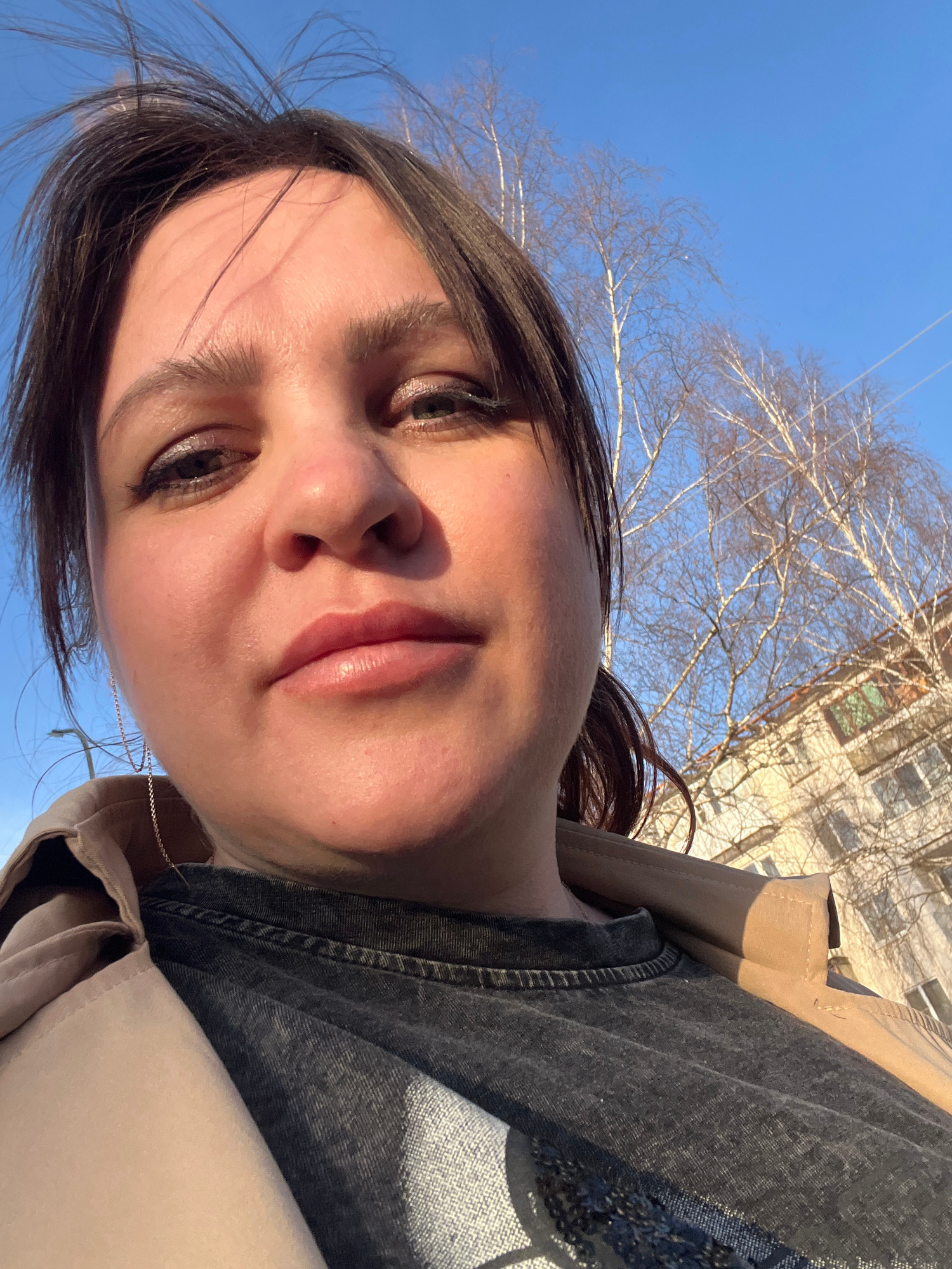A close-up, low-angle selfie of a young woman. The sky is blue and clear. Bare branches of trees are visible in the background, along with a building. The woman wears dark clothing and a light-colored…read more