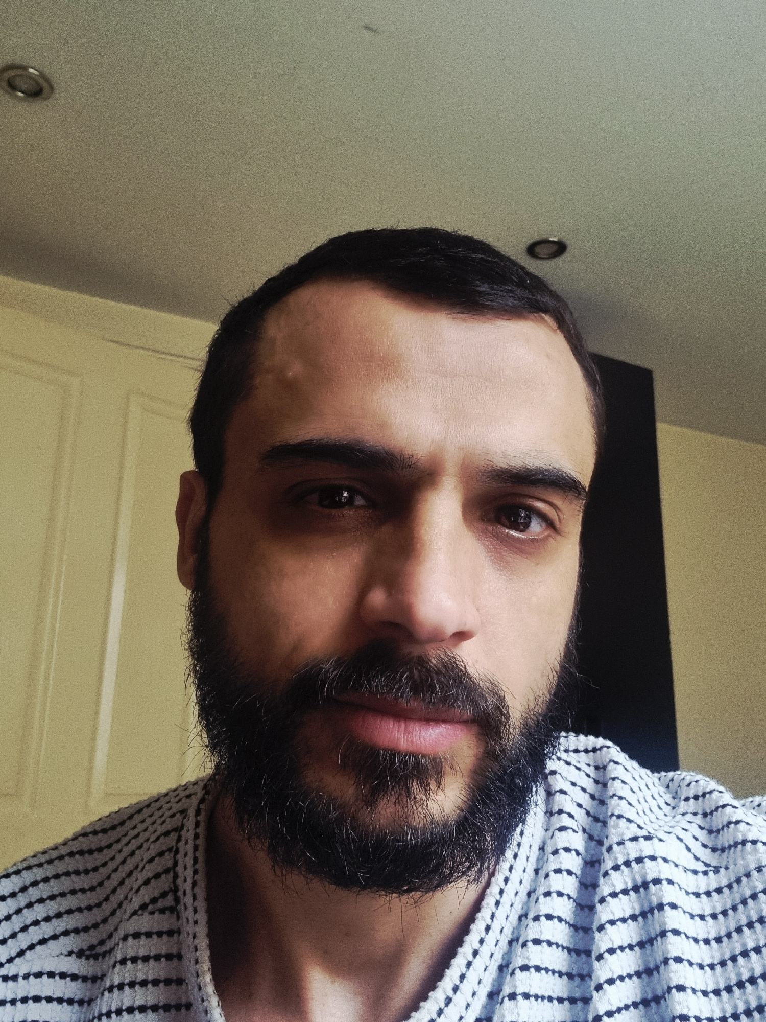 A close-up portrait of a man with dark hair, a beard, and brown eyes is presented. He is wearing a white and blue striped shirt. The background includes an off-white wall with a circular light fixture…read more