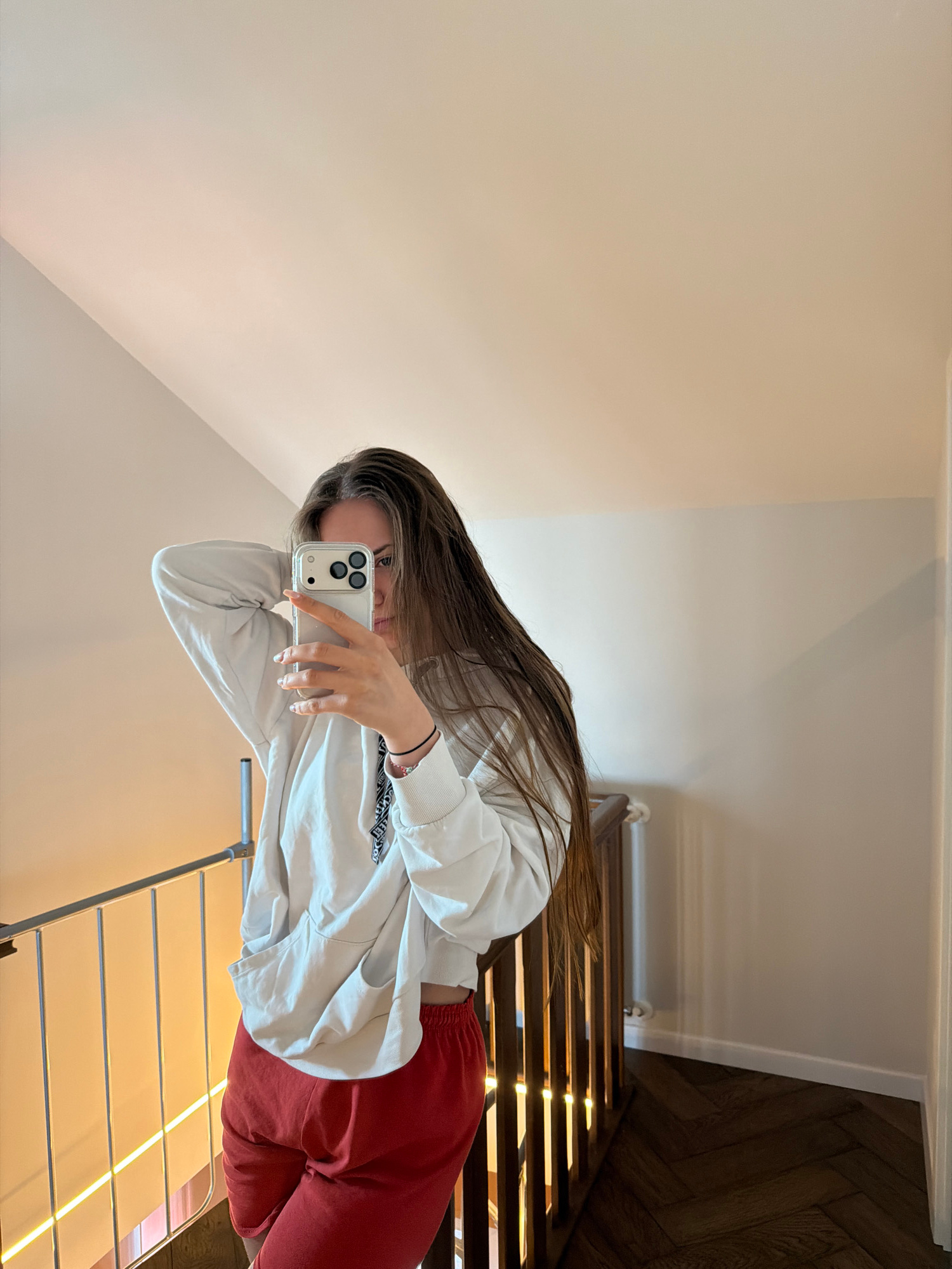 A young woman with long, brown hair is taking a selfie indoors, near a staircase. She is holding a white smartphone in front of her face, covering most of it. She is wearing a white hooded sweatshirt…read more