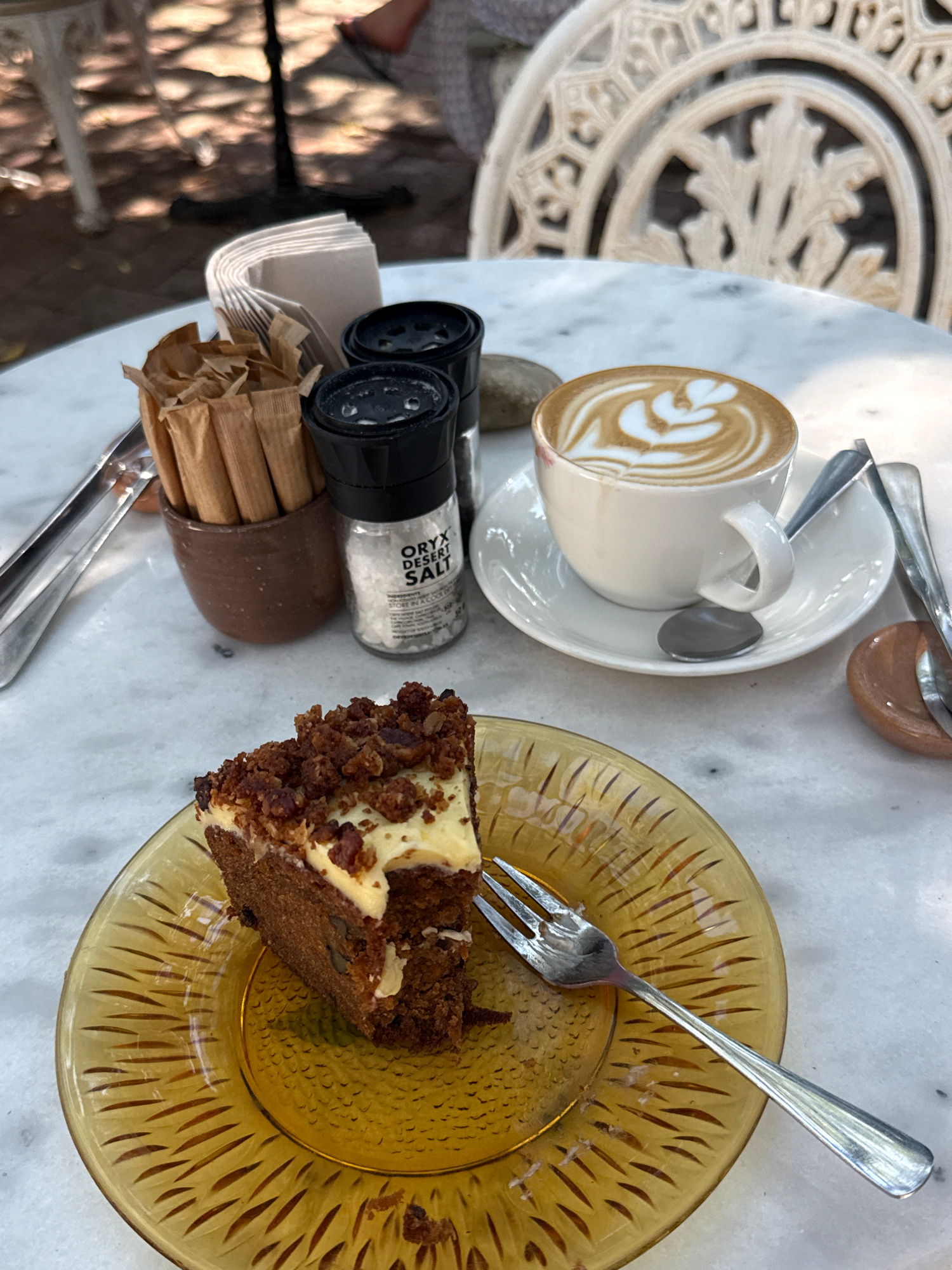 The image shows a partially eaten slice of carrot cake on a textured amber glass plate, along with a latte in a white cup and saucer on a marble table. A fork rests on the plate. A brown ceramic conta…read more