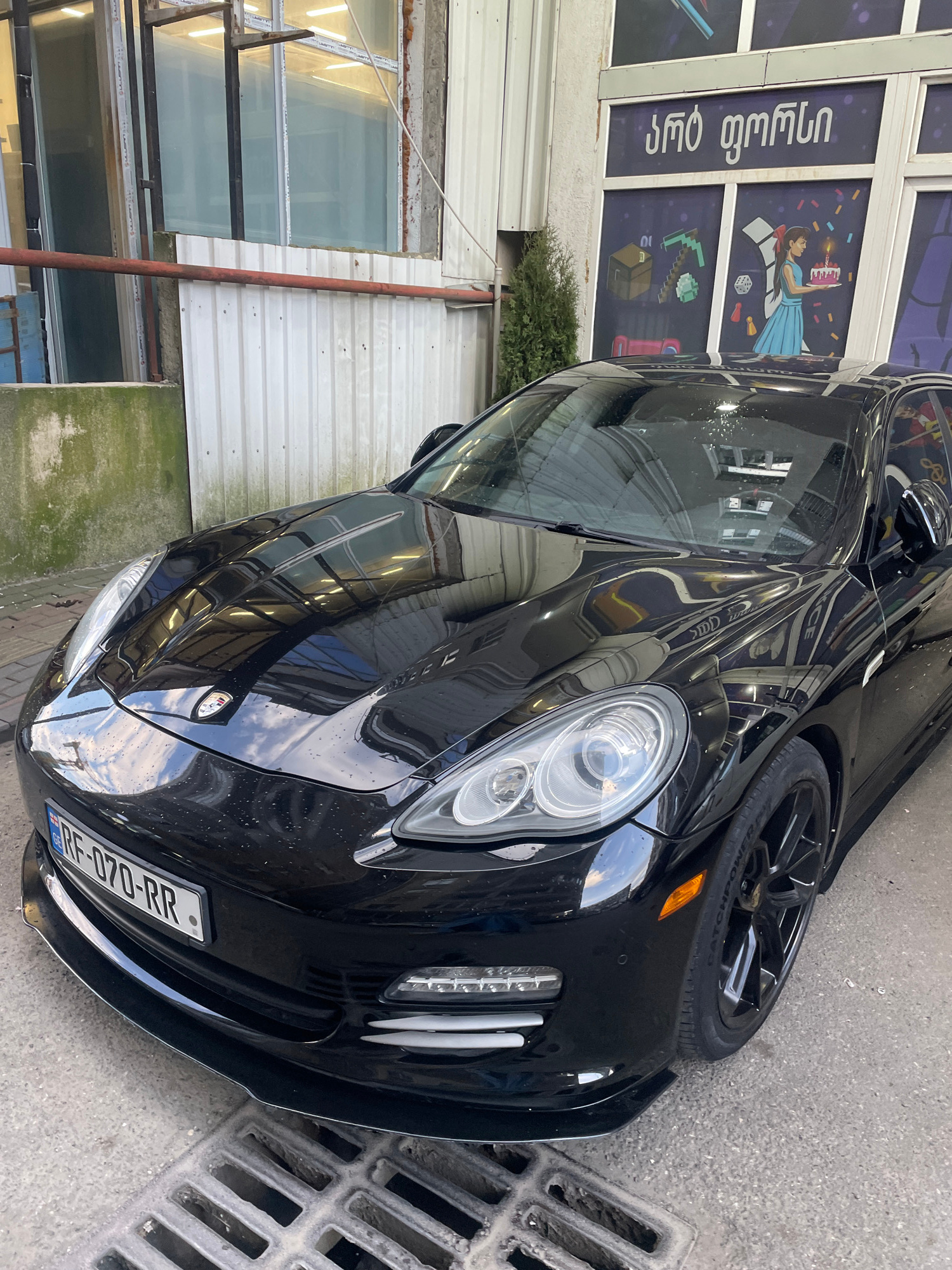 A close-up shot depicts the front of a black Porsche Panamera, parked at an angle on a street in Batumi, Georgia. The car's headlights, front bumper, and license plate ("RF-070-RR") are visible. The r…read more
