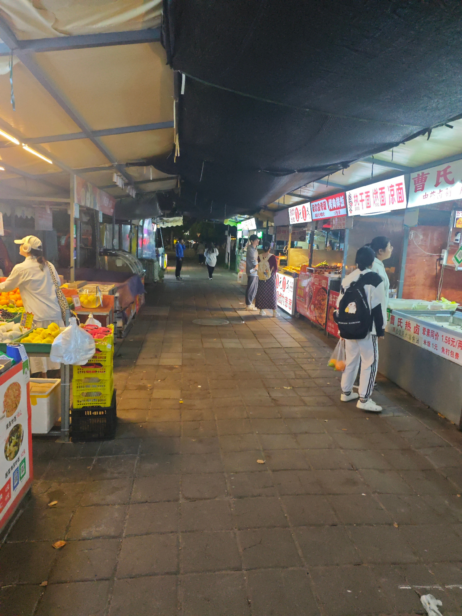 The image depicts a street scene in the Shapingba District of China at night. Vendors are selling food and fruit. Patrons are standing in front of food stalls, waiting to be served. People are walking…read more