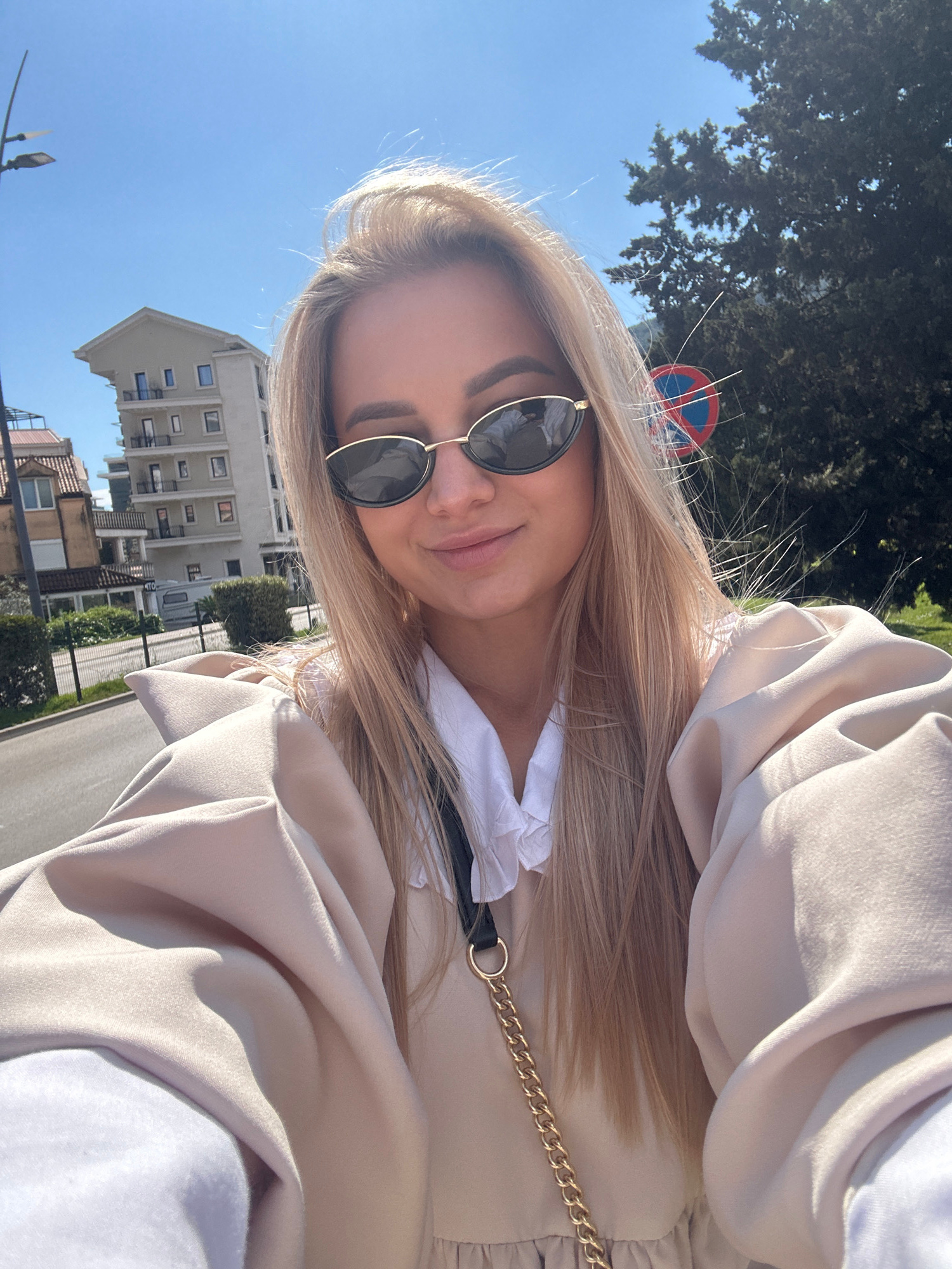 The image is a selfie taken by a young woman with blonde hair and sunglasses, likely in Budva, Montenegro. She is wearing a light-colored blouse and a dress with a gold chain strap. A building with ba…read more