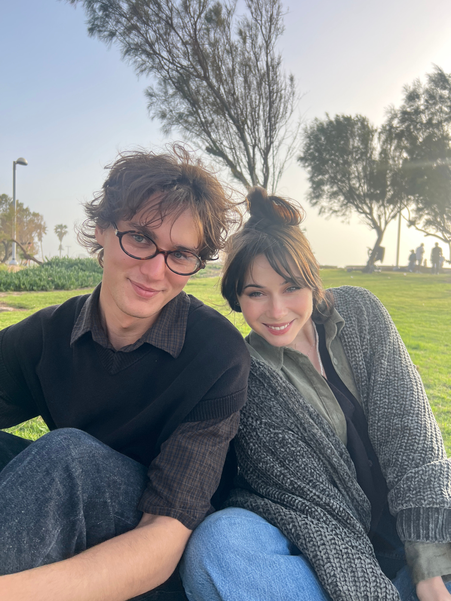 Two individuals, a male and a female, are posing for a photograph outdoors. The woman is leaning back on top of the man, who is seated on the ground. The man is wearing glasses and dark clothing. The…read more