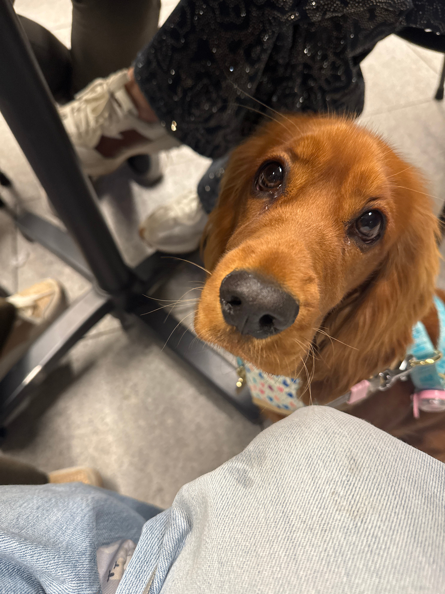 A close-up, tilted perspective captures a brown dog with large, dark eyes and a wet nose. The dog is wearing a light blue collar with a polka dot and heart pattern, and an attached pink device. To the…read more