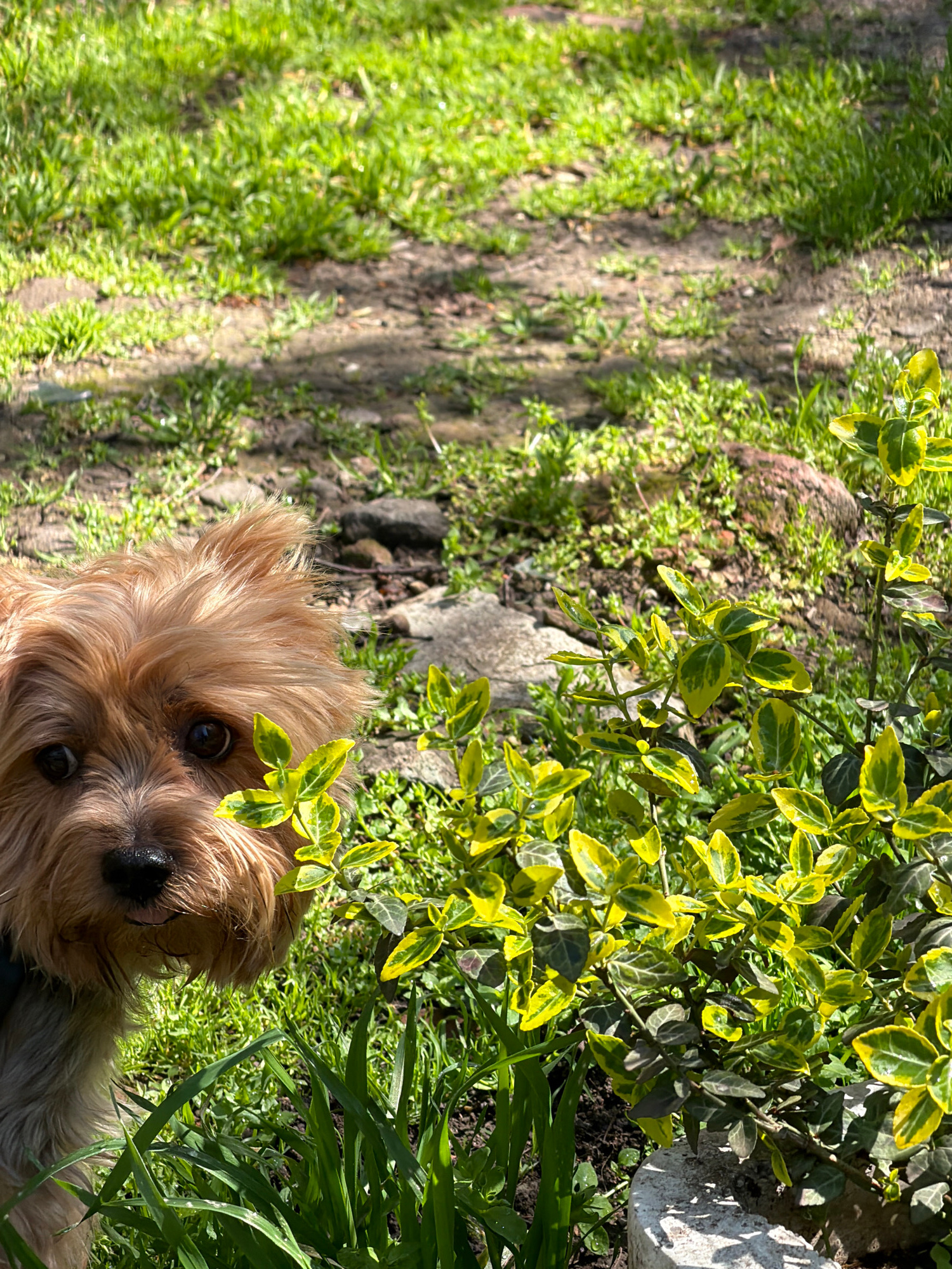 A tan Yorkshire Terrier dog is positioned in the foreground of an outdoor scene, likely a garden or park. The dog's face is prominent, with dark eyes and a black nose visible. The dog is partially obs…read more