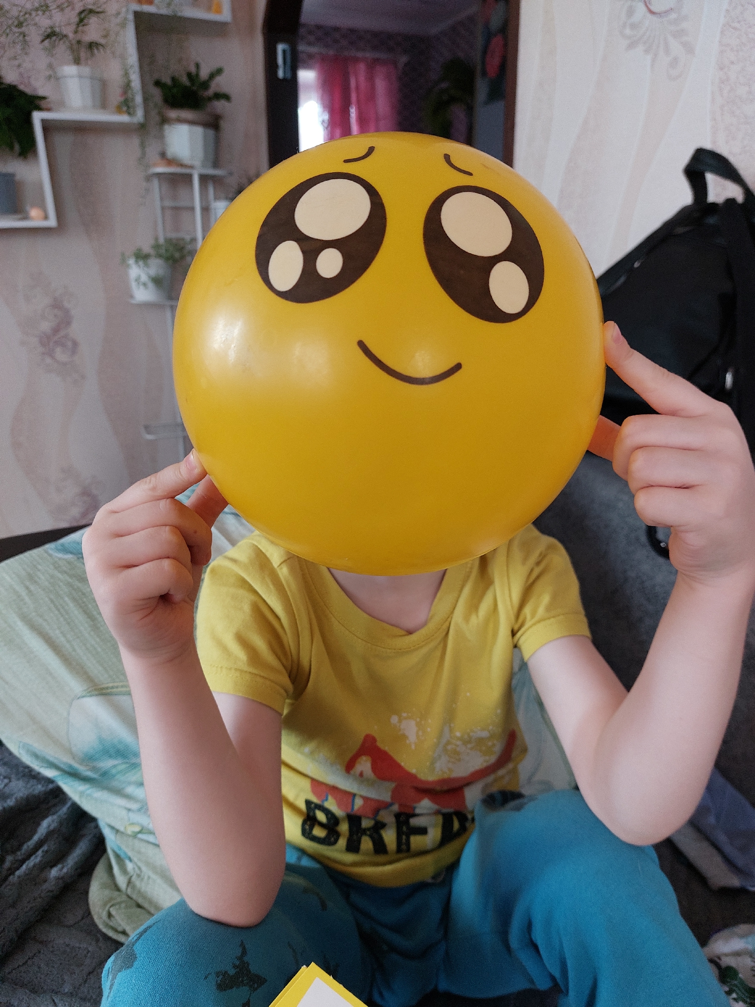 An indoor, close-up image shows a child lying down and playfully holding a large, bright yellow balloon that features a cheerful emoji face. The child's face is completely obscured by the balloon, whi…read more