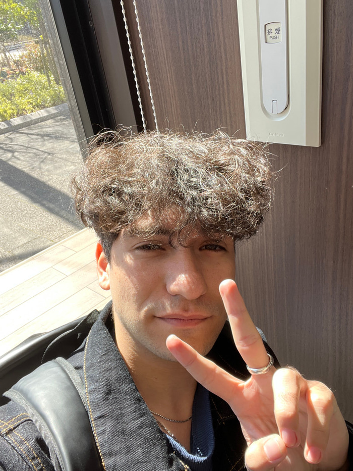 A male individual with dark, curly hair and light skin is depicted in a medium-shot, facing the camera. He wears a dark denim jacket over a dark blue garment, a thin silver chain around his neck, and…read more
