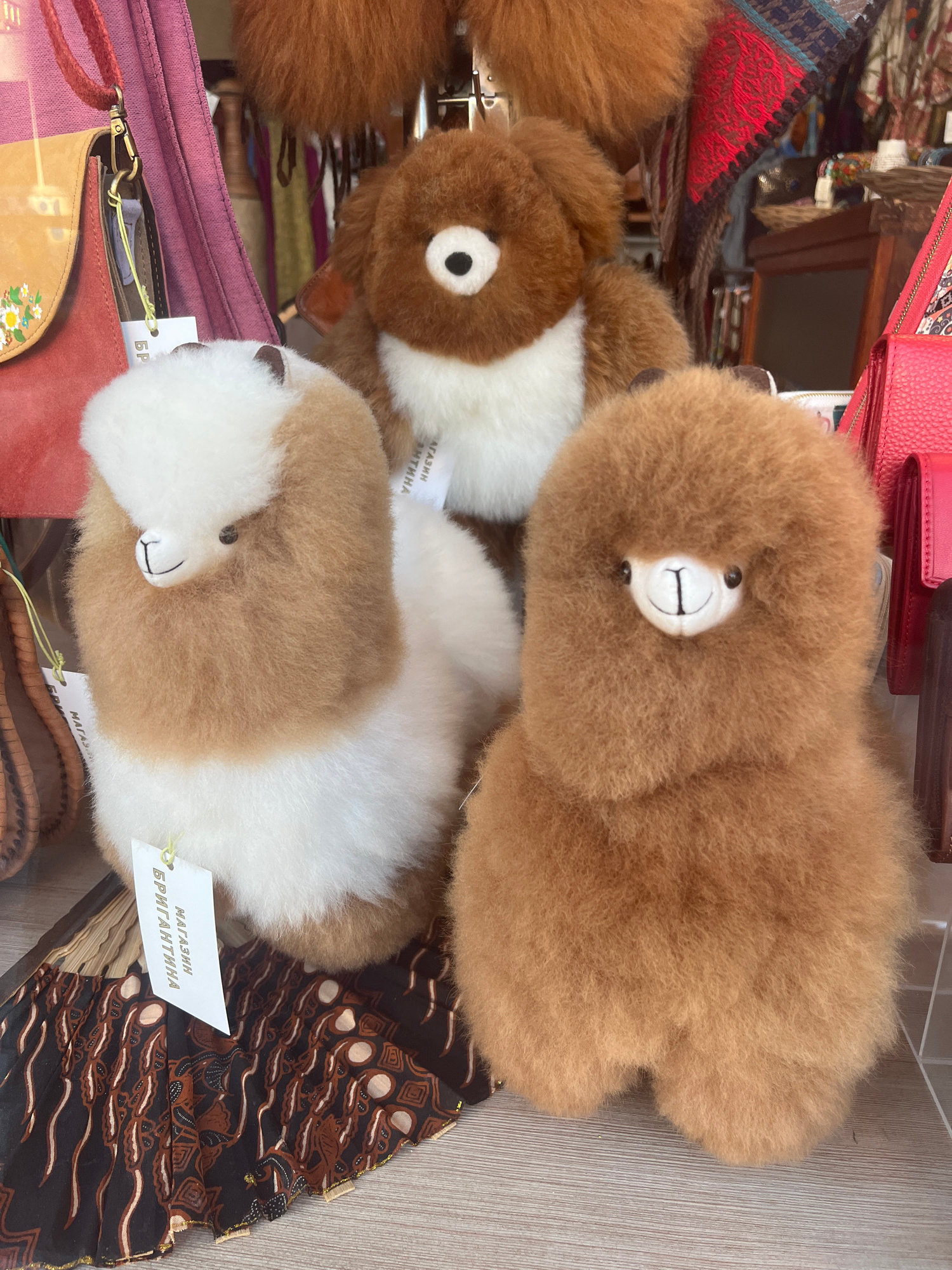 The image shows a close-up view of several stuffed animal toys displayed for sale, likely in a shop setting in Varna, Bulgaria. The toys appear to be made from alpaca wool or a similar fluffy material…read more