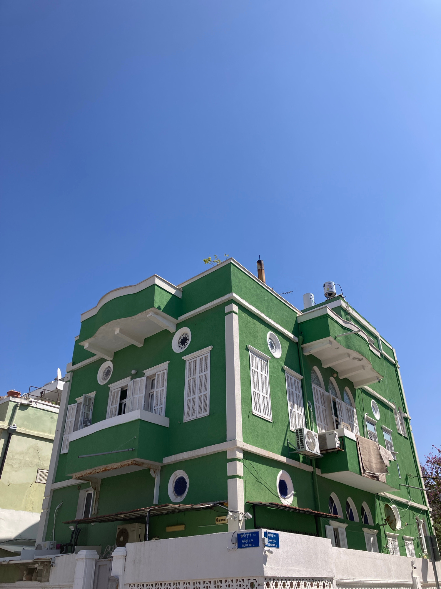 The image captures a building located in Tel-Aviv, Israel, standing out with its green facade and white trim. The building features a multi-story structure with a mix of rectangular and circular windo…read more