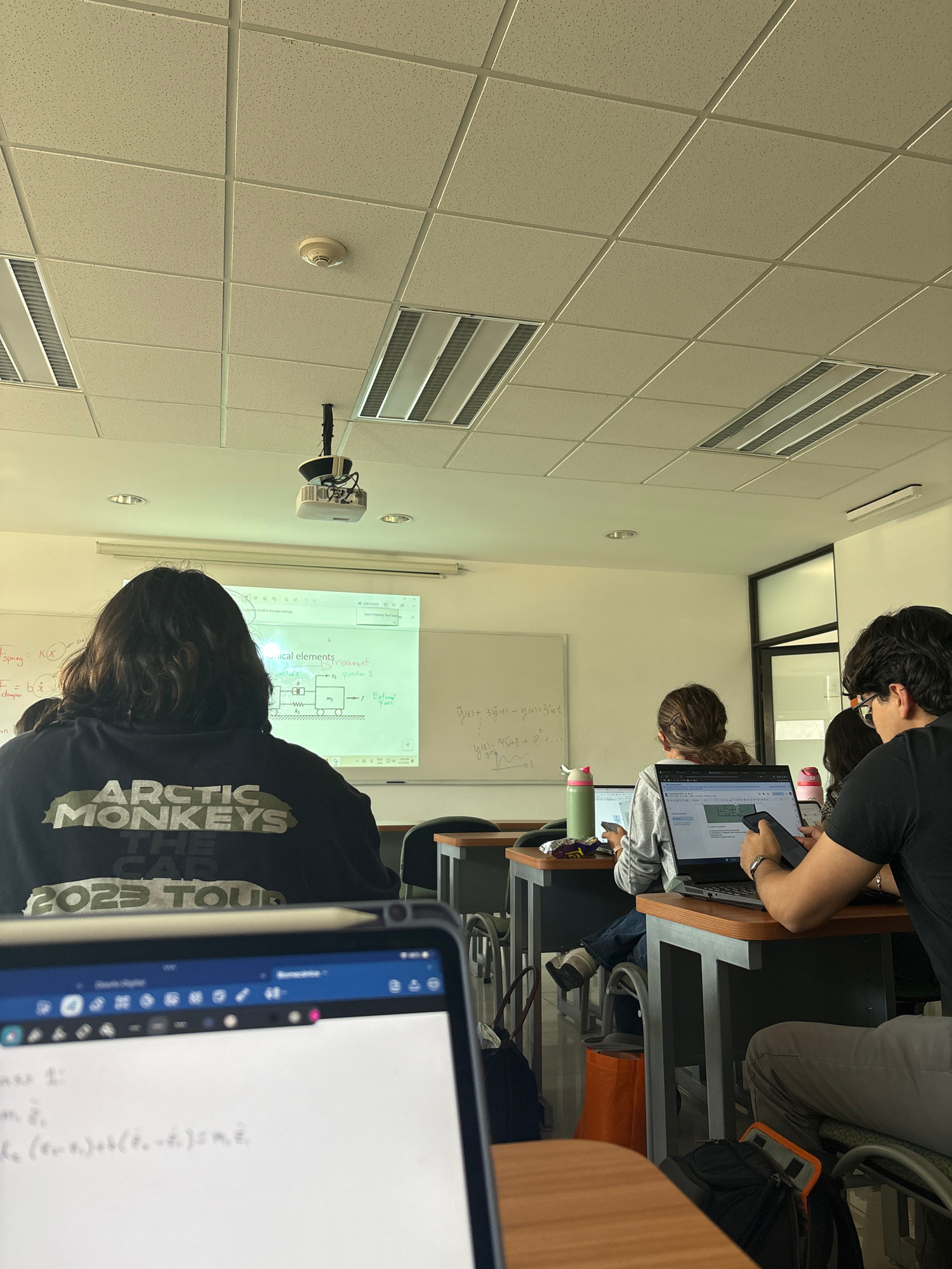 The image shows a classroom scene in what appears to be a university setting in San Andrés Cholula, Mexico. Several students are seated at desks, working on laptops and tablets. On the walls, there ar…read more